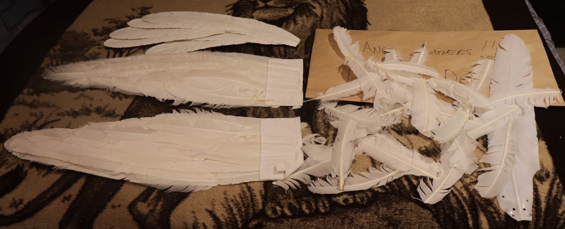 These are a prototype set made for when he was a child but never used. The loose feathers, some are from the other wings and some are unused extras. If you win one of the nice sets you may want these for future repairs, or nice resale lot. They are what they are!