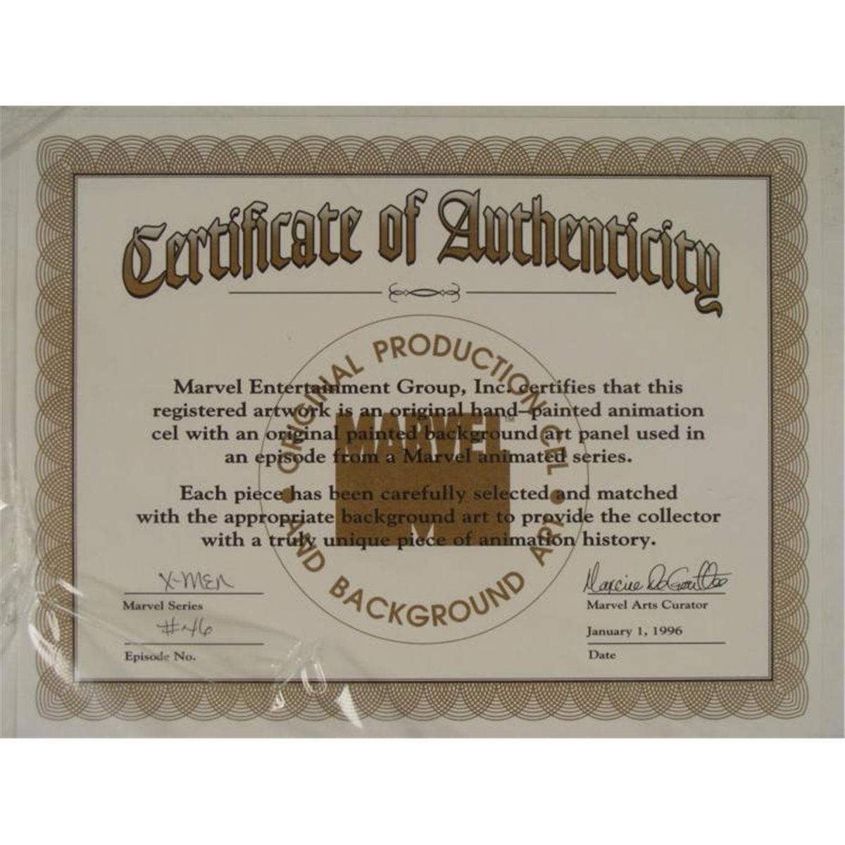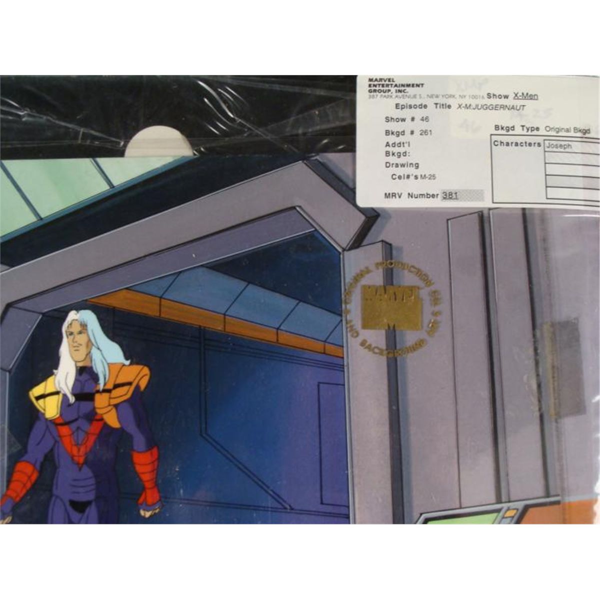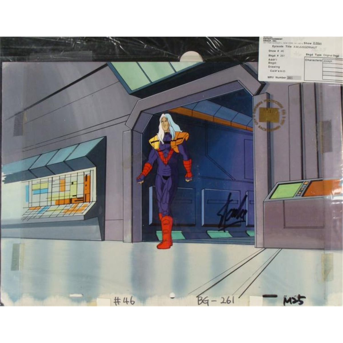 This is an original signed production cel and background from the hit series X-Men. Stan Lee signature is located on the bottom right of cel in black sharpie. * Under a cloud of increasing anti-mutant sentiment, Professor Xavier creates a haven at his Westchester mansion to train young mutants to use their powers for the benefit of humanity, and to prove mutants can be heroes. Xavier recruited Cyclops, Iceman, Angel, Beast and Jean Grey calling them "X-Men" because they possessed the "x-gene", an ability normal humans lacked. Early issues introduced the team's arch enemy, Magneto and his Brotherhood of Evil Mutants, who would later battle the X-Men for years. * Hey, what did I miss?? * * Original Animated Cel Overall Size of the Cel: 10 1/2" x 12 1/2" Overall Size of the background: 10 1/4" x 14 1/4" Excellent Condition This is an original hand-painted cel set-up used in the production of an episode of X-Men titled "Juggernaut." Each one-of-a-kind set-up represents a slight change in position of the characters. When individually photographed and projected in rapid succession, the images appear to move. * To create production cels, the original animator's drawing is transferred onto an acetate cel (by hand-inking and/or photo copying). The cel is then hand-painted on the reverse side. The background accompanying this set-up is a lasergraphic background. * The cel and original background is ready to be matted and framed. The animators notations are located at the bottom of the cel and background. A certificate of Authenticity from Marvel is on the back of background. The Marvel Seal is located at the top right of the cel. The cel and background are in a protective sleeve An information card about the episode is located at the top right of the protective sleeve. *