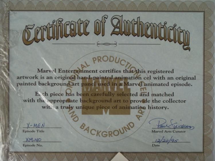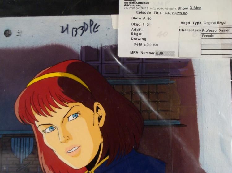 This is an original signed production cel and background from the hit series X-Men. Stan Lee signature is located on the bottom right of cel in black sharpie. * Under a cloud of increasing anti-mutant sentiment, Professor Xavier creates a haven at his Westchester mansion to train young mutants to use their powers for the benefit of humanity, and to prove mutants can be heroes. Xavier recruited Cyclops, Iceman, Angel, Beast and Jean Grey calling them "X-Men" because they possessed the "x-gene", an ability normal humans lacked. Early issues introduced the team's arch enemy, Magneto and his Brotherhood of Evil Mutants, who would later battle the X-Men for years. * Did you hear something?? * * Original Animated Cel Overall Size of the Cel: 10 1/2" x 12 1/2" Overall Size of the background: 10 1/4" x 14 1/4" Excellent Condition This is an original hand-painted cel set-up used in the production of an episode of X-Men titled "Dazzled." Each one-of-a-kind set-up represents a slight change in position of the characters. When individually photographed and projected in rapid succession, the images appear to move. * To create production cels, the original animator's drawing is transferred onto an acetate cel (by hand-inking and/or photo copying). The cel is then hand-painted on the reverse side. The background accompanying this set-up is an original production background. * The cel and original background is ready to be matted and framed. The animators notations are located at the bottom of the cel. A certificate of Authenticity from Marvel is on the back of background. The Marvel Seal is located at the bottom left of the cel. The cel and background are in a protective sleeve An information card about the episode is located at the top right of the protective sleeve. *