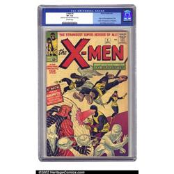 X-Men #1 (Marvel, 1963) CGC VF- 7.5 Off-white pages. All things mutant sprang from this important seminal issue. Little did anyone realize back in the 1960s just how huge the mutant movement would become. Not Marvel's top seller, this title fell into reprints, and eventual cancellation, before being revived like a phoenix from the ashes at the hands of Claremont and Cockrum in 1975. No one, not even Stan Lee, could have predicted the ultimate success of this title which went on to become the runaway best seller of the entire decades of the eighties and nineties...decades in which mutants seemed to propagate like rabbits. With another movie in the works, now is a good time to obtain a copy of this hugely significant Marvel key #1 issue. Origin and first appearance of the X-Men. First appearance of Magneto. Jack Kirby cover and art. Overstreet 2002 VF 8.0 value = $4,000. Important notice: We expect to be auctioning lots at the rate of 200-250 per hour. Sometimes eBay Premier live bid software cannot keep up with that pace, so we strongly recommend that you place a realistic proxy bid now as insurance to avoid disappointment. Also please note that all Heritage/CAA lots purchased through eBay Premier carry a 20% Buyer's Premium. Please make sure you read the Terms and Conditions.