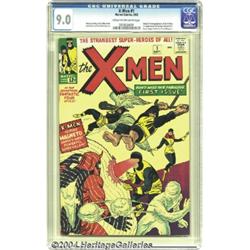 <B>X-Men #1 (Marvel, 1963) CGC VF/NM 9.0 Cream to off-white pages.</B></I> The X-Men are the most popular superhero group around, and that status isn't likely to change anytime soon. The group, their mentor Professor X, and their most important foe, Magneto, made their first appearances here, drawn by the X-Men's co-creator, Jack Kirby. The fact that Iceman's role in the movies seems to be expanding, and that the last movie even offered a very brief glimpse of the Beast, can only make the first appearances of these characters even more valuable. As it stands, this issue is on Overstreet's list of the top ten Silver Age books. This copy is VF/NM, putting it in the top 5% of the unrestored copies CGC has certified to date. Overstreet 2004 VF/NM 9.0 value = $9,405; NM- 9.2 value = $13,000. <BR><BR><B>Important notice:</B> Heritage usually auctions material at the rate of 200-250 lots per hour. On some occasions eBay Live bid software or the Internet may not be able to keep up with the pace of the auction. We recommend placing a realistic absentee bid now as insurance to avoid disappointment. Occasionally the auctioneer may eliminate or reject an eBay Live bid, and the auctioneer may also reopen a lot after the close of the eBay live bidding (usually because we missed an audience bid), and may reject your bid even if it shows you as the winning bidder. By bidding via eBay Live, you agree that Heritage may award the lot to another bidder at its sole discretion under the circumstances described above or any other reasonable circumstances. Since eBay bids are not shown to us until we open the lot on the floor, we treat those bids just like floor bids. In most cases the floor responds before the eBay bid is presented to us, due to Internet lag time, so for consistency we have made it a policy that floor bids are always considered first over tie eBay live bids. Also please note that all Heritage lots purchased through eBay Live carry a 20% Buyer's Premium. Please make sure you read the Terms and Conditions before you bid. </span></font></tr></table></td></tr></table>