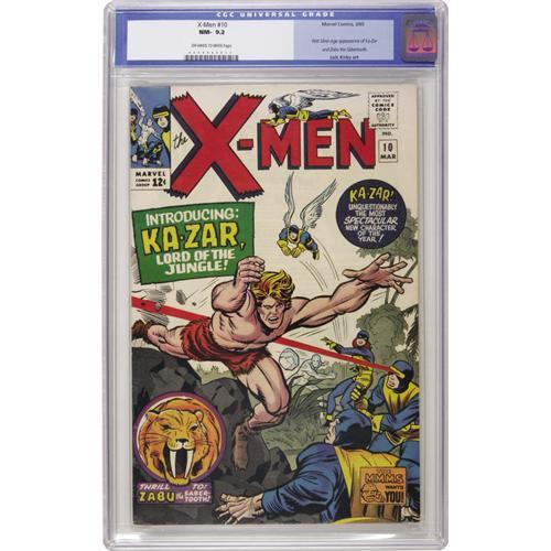 <B>X-Men #10 (Marvel, 1965) CGC NM- 9.2 Off-white to white pages.</B></I> Jack Kirby's art graced the cover and interior of this issue, which provided the first Silver Age appearances of Ka-Zar and Zabu the Sabertooth. This is an unusually clean copy. At this writing, CGC has certified well over three hundred copies of this issue, and only nine have received higher grades than the grade here. Overstreet 2006 NM- 9.2 value = $625. CGC census 3/07: 29 in 9.2, 9 higher.<BR><BR><b>Shipping:</b> Slabbed Comic (<a target="_blank" href="http://www.heritageauctions.com/common/shipping.php">view shipping information</a>)