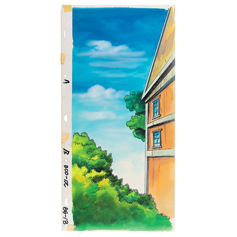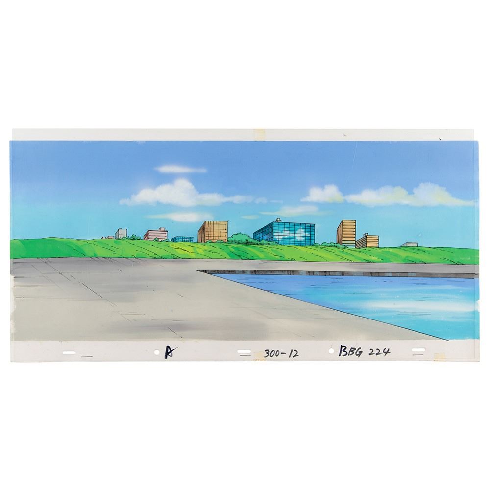 (Marvel Productions, 1994) Exquisite collection of ten panorama production watercolor background paintings with cel overlays from X-Men: The Animated Series, all from season three, episode twelve, entitled 'Savage Land, Strange Heart: Part 1.' The backgrounds range in size from 21.25 x 10.5 to 31 x 10.5, with the line-drawing overlays adding detail to the sci-fi scenes. The stunning backgrounds feature suburban scenes, cityscapes, and municipal building interiors—some showing destruction to the buildings. In overall fine condition, with some edgewear.