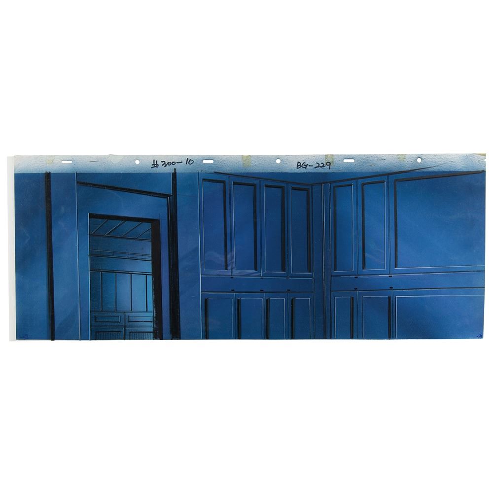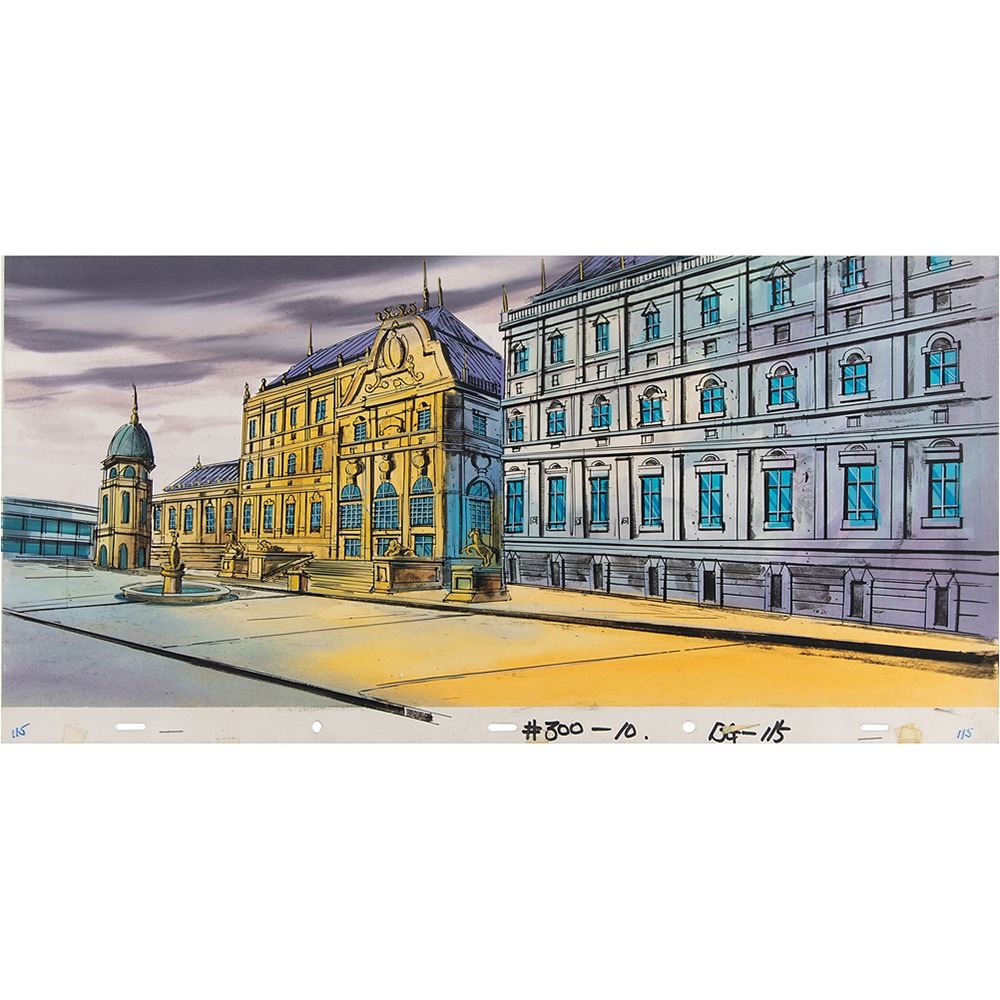 (Marvel Productions, 1994) Fantastic collection of ten panorama production watercolor background paintings with cel overlays from X-Men: The Animated Series, all from season three, episode one, entitled 'X-Men: Out of the Past.' The backgrounds range in size from 18 x 11 to 28.5 x 10, with all but one featuring a line-drawing overlay adding detail to the scene. The stunning backgrounds include scenes of Stonehenge, cityscapes, and various interiors. In overall fine condition, with some edgewear.
