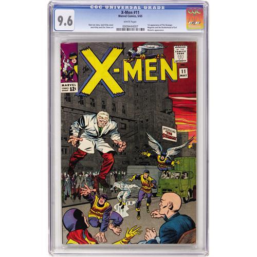 <B>X-Men #11 (Marvel, 1965) CGC NM+ 9.6 White pages.</B></I> Pristine copy comes mighty close to being the finest certified by CGC to date of #11. First appearance of the Stranger, but Magneto and the Brotherhood of Mutants have practically become regulars. Jack Kirby cover and art. Overstreet 2006 NM- 9.2 value = $700. CGC census 3/07: 2 in 9.6, 1 higher. <I> From the Janowicz Collection.</B></I><BR><BR><b>Shipping:</b> Comics - Slabbed (certified) (<a target="_blank" href="http://www.heritageauctions.com/common/shipping.php">view shipping information</a>)