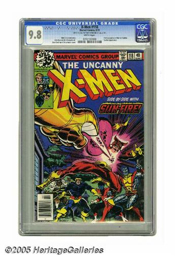 <B>X-Men #118 (Marvel, 1979) CGC NM/MT 9.8 White pages.</B></I> Wolverine's love interest Mariko Yashida made her first appearance in this issue, which sees the X-Men going to Japan and even meeting up with Sunfire, their former teammate and a relative of Mariko. It's love at first sight for Wolvie, who reveals that he can speak Japanese, to the astonishment of his teammates. The issue has John Byrne interior art. The cover is by Dave Cockrum and Terry Austin. Overstreet 2005 NM- 9.2 value = $40. CGC census 5/05: 11 in 9.8, none higher. <I>From the collection of Joe and Nadia Mannarino.</B></I>