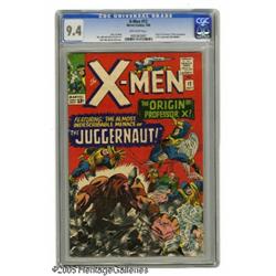 <B>X-Men #12 (Marvel, 1965) CGC NM 9.4 Off-white pages.</B></I> With the origin of Professor X and a Jack Kirby cover with Alex Toth art, there's a lot to like about this issue. It's also got the first appearance of Professor X's brother Cain Marko, aka the Juggernaut. (Cain Marko, mark of Cain - geddit? It's a fairly clever Biblical reference.) This impressive copy is one of the best. To date, only two certified copies have been graded higher by CGC. Overstreet 2004 NM- 9.2 value = $650. CGC census 1/05: 14 in 9.4, 2 higher.