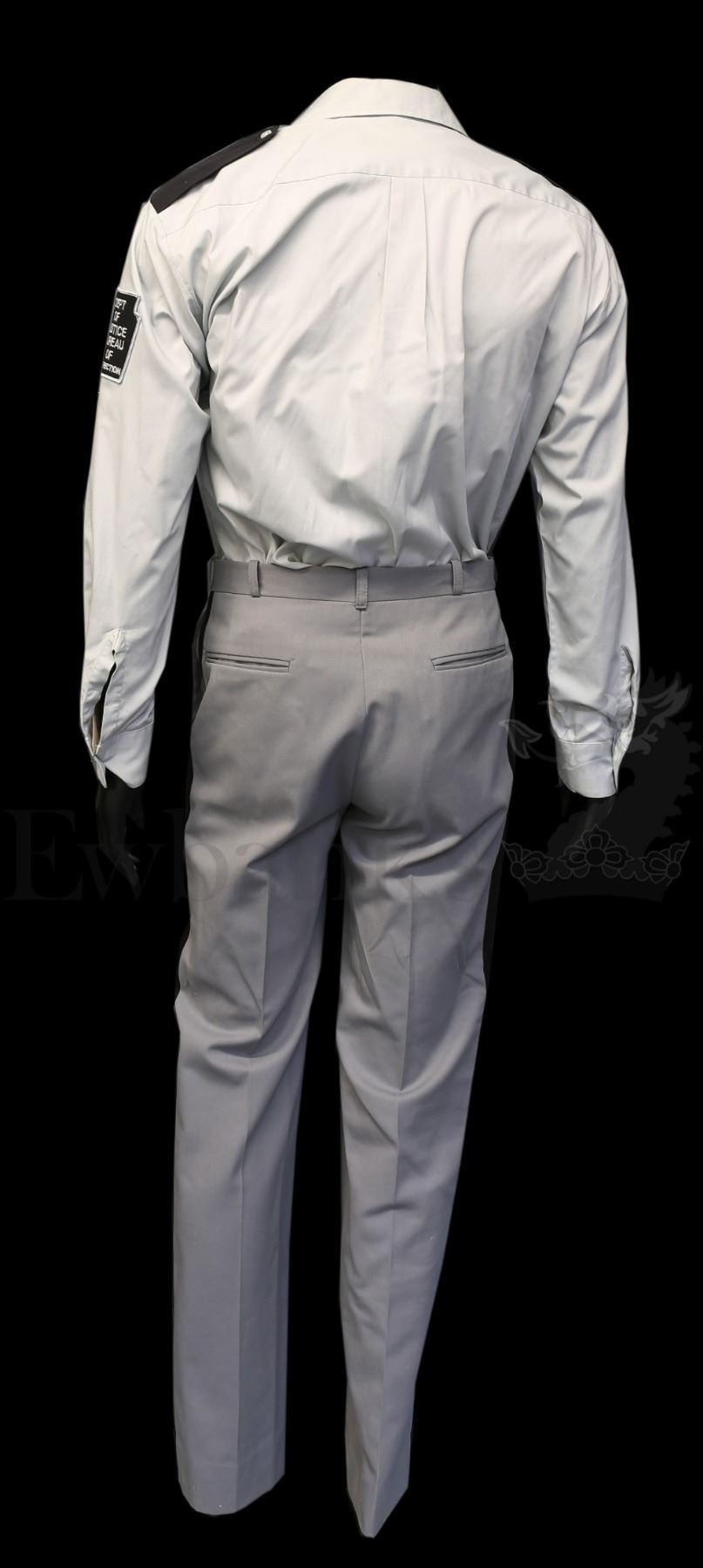 † X-Men 2 (2003) 'Mitchell Laurio' (Ty Olsson), Prison Guard Uniform. Laurio is the head guard in charge of Magneto in his plastic prison and plays a principal part in the film's storyline. This costume is clearly seen in several scenes. The uniform comprises of Trousers/Pants, T-Shirt and Shirt. The Shirt has 'Dept Justice Bureau Of Correction' embroidered patches on each upper arm sleeve. The costume still retains it's original Wardrobe Tags. Accompanied by a 20th Fox certificate of authenticity. Please note that VAT is payable on top of the hammer price at 20% in addition to standard buyers premium inc. VAT for this lot.