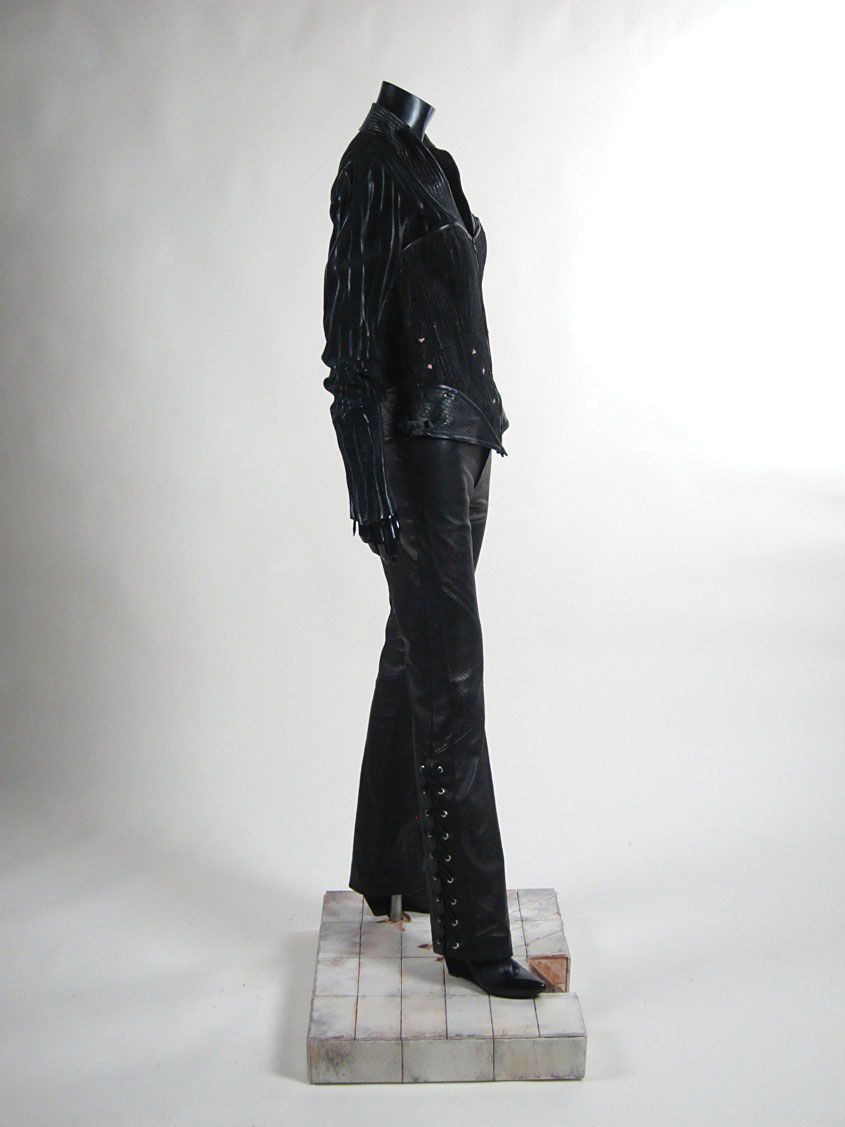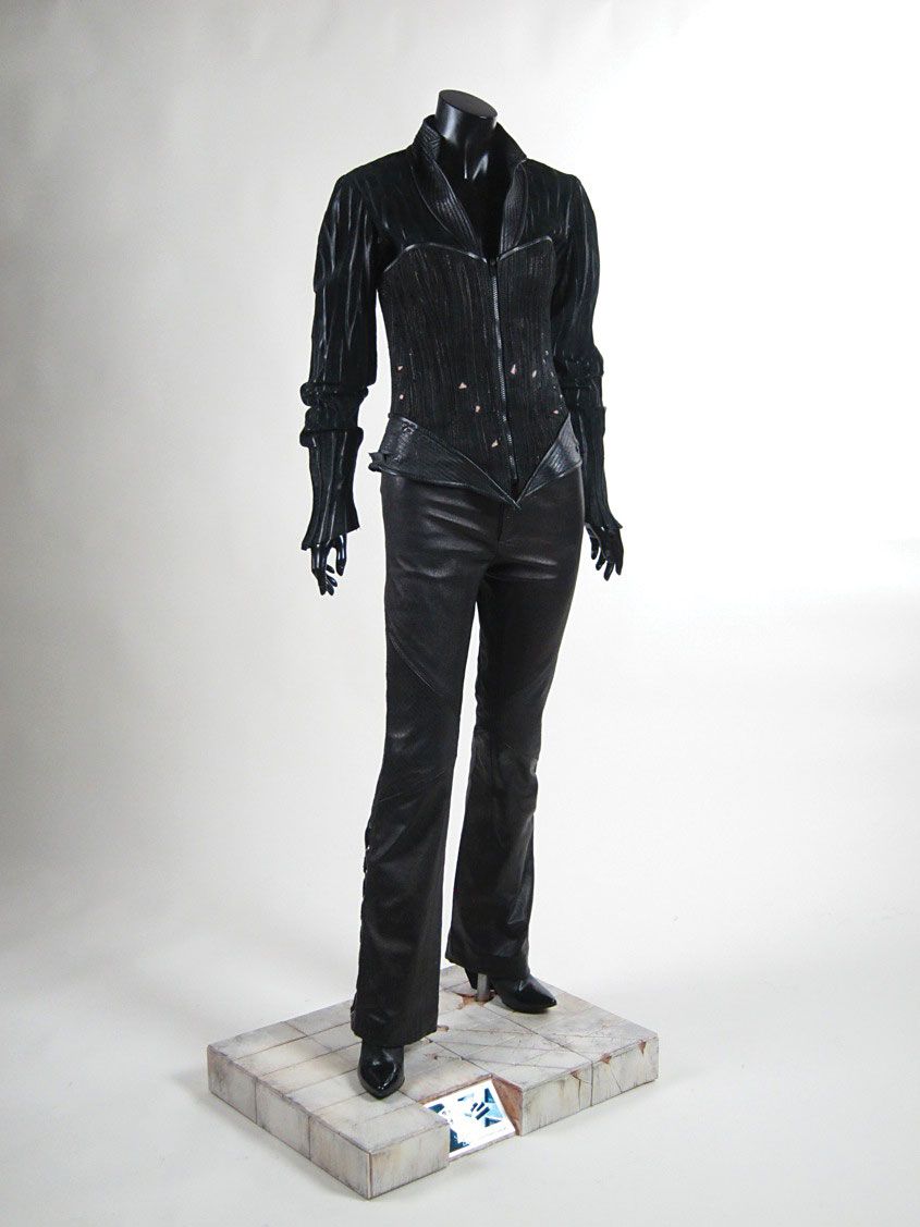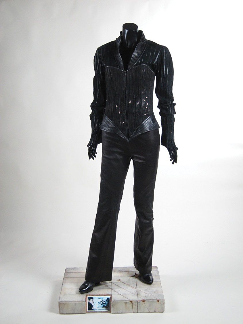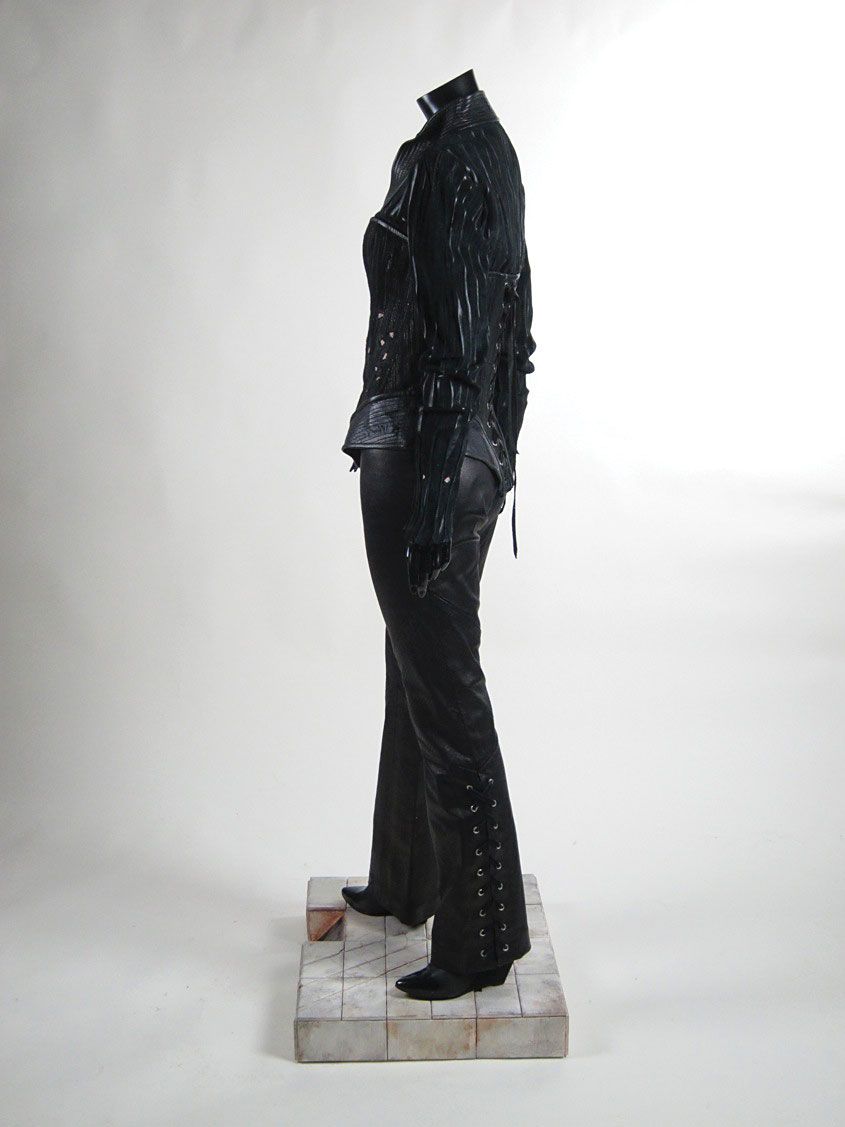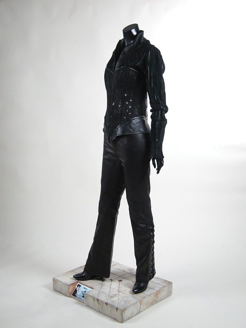 Screen-worn costume from the 2003 action film X-Men 2, worn by Kelly Hu as Lady Deathstrike during scenes near the end of the film when she battled Wolverine. The all-black costume consists of a corset-style jacket with laces up the back and various holes from Wolverine's claws in the front, as well as a short zipper; and a pair of leather trousers, with lacing up the bottoms. Costume is displayed on a custom-made mannequin and stand made to look like the adamantium chamber where Lady Deathstrike was killed by Wolverine, even showing the claw marks where he had sliced along the floor. Base measures approximately 24? x 18.5?, and mannequin stands 66? tall.