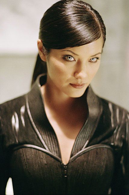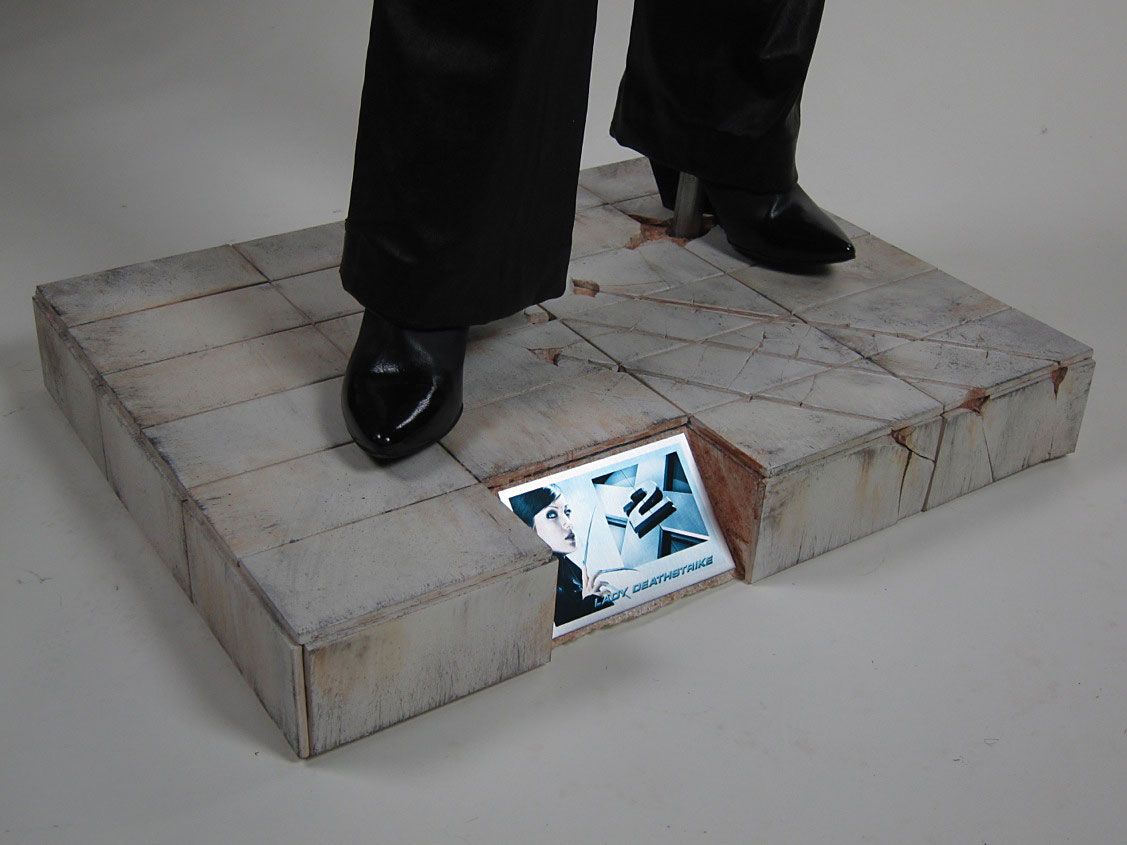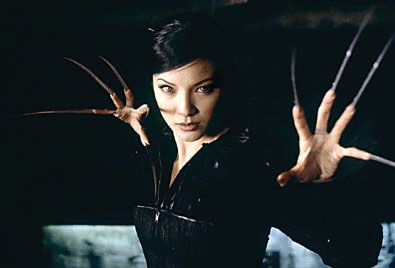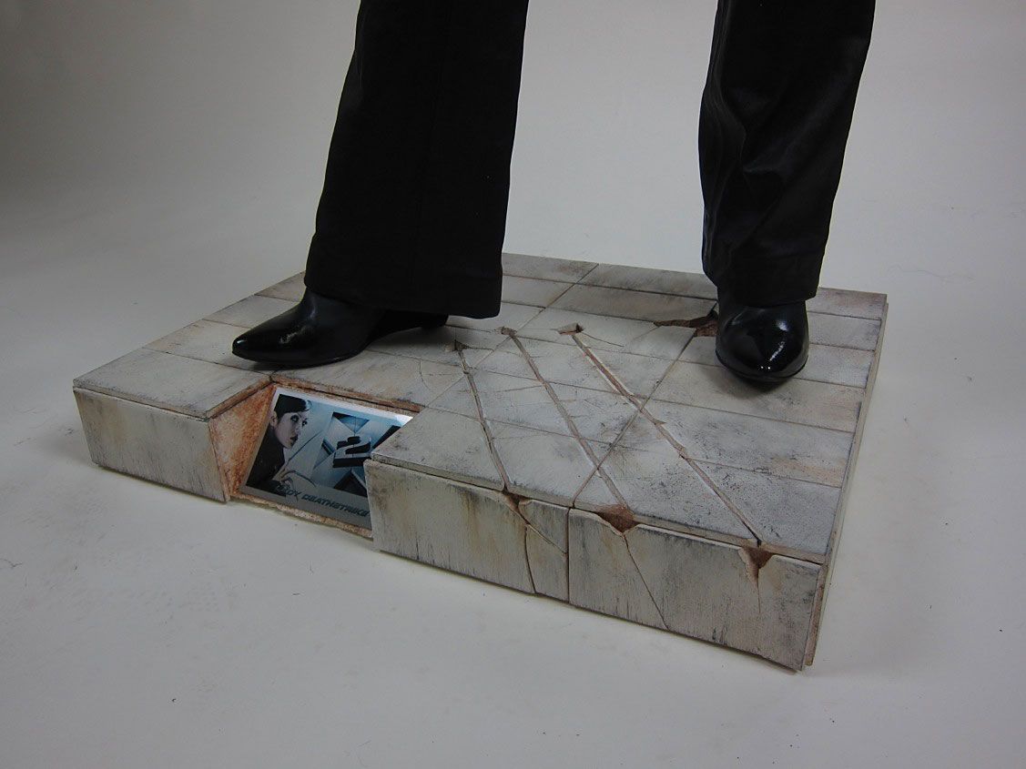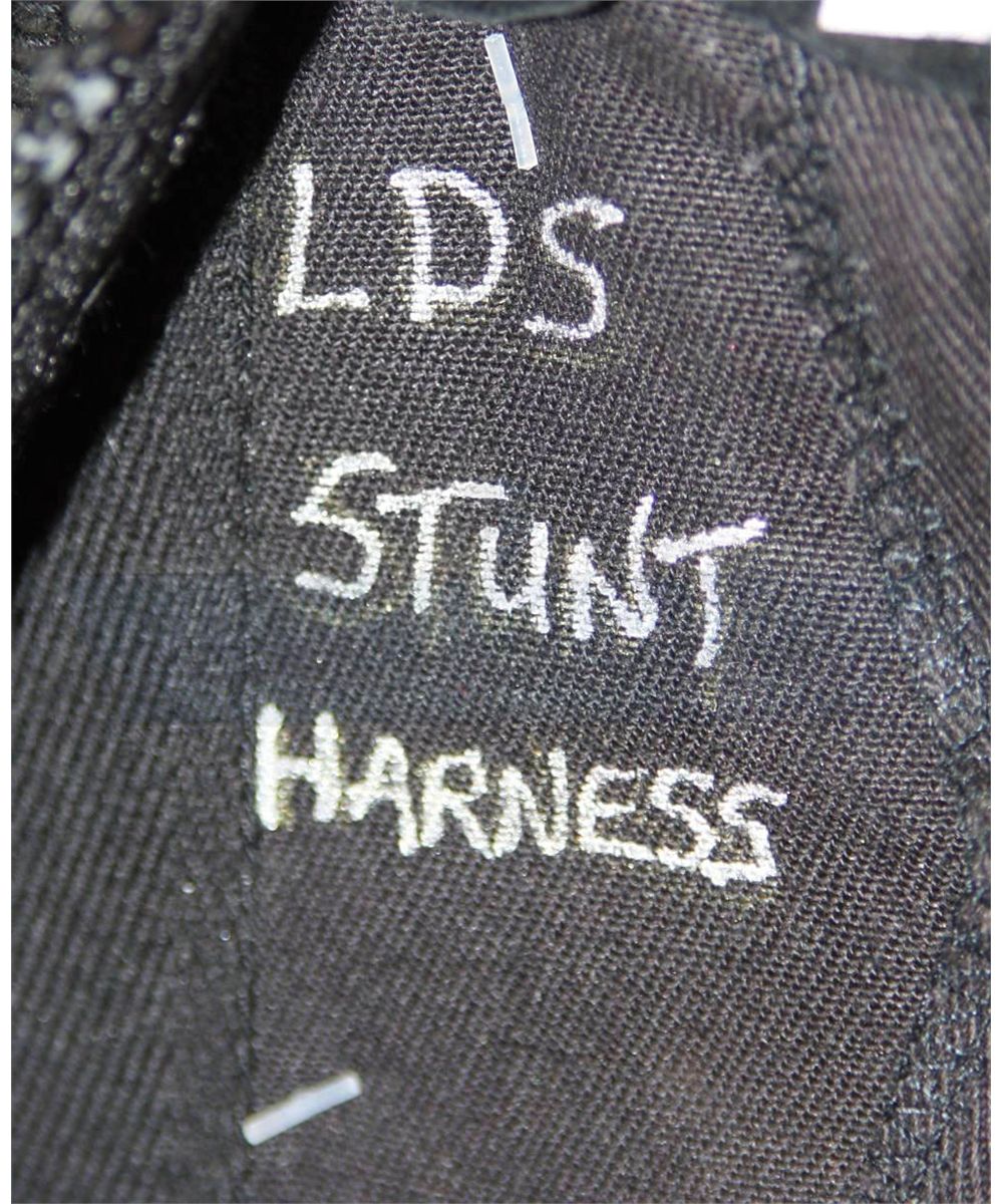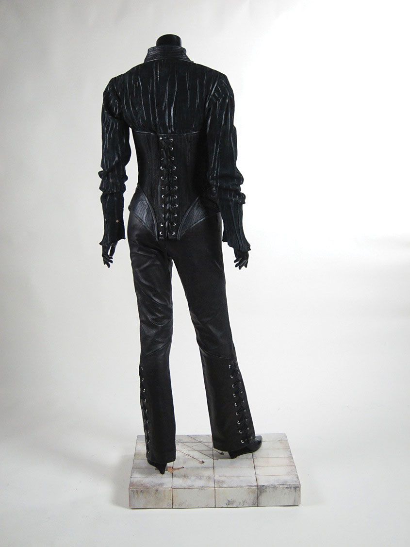Screen-worn costume from the 2003 action film X-Men 2, worn by Kelly Hu as Lady Deathstrike during scenes near the end of the film when she battled Wolverine. The all-black costume consists of a corset-style jacket with laces up the back and various holes from Wolverine's claws in the front, as well as a short zipper; and a pair of leather trousers, with lacing up the bottoms. Costume is displayed on a custom-made mannequin and stand made to look like the adamantium chamber where Lady Deathstrike was killed by Wolverine, even showing the claw marks where he had sliced along the floor. Base measures approximately 24? x 18.5?, and mannequin stands 66? tall.