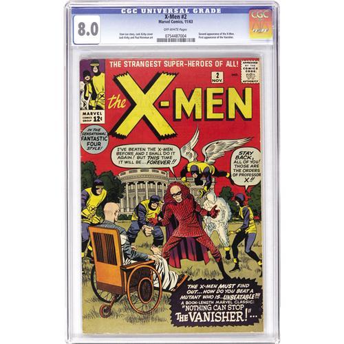 <B>X-Men #2 (Marvel, 1963) CGC VF 8.0 Off-white pages.</B></I> Here's the second appearance of the X-Men, also featuring the first appearance of the villainous Vanisher. Stan Lee handled story chores, with co-creator Jack Kirby seeing to the cover and interior art. Overstreet 2006 VF 8.0 value = $1,310. CGC census 5/06: 32 in 8.0, 55 higher. <BR><BR><B>Important notice:</B> Heritage usually auctions material at the rate of 200-250 lots per hour. On some occasions eBay Live bid software or the Internet may not be able to keep up with the pace of the auction. We recommend placing a realistic absentee bid now as insurance to avoid disappointment. Occasionally the auctioneer may eliminate or reject an eBay Live bid, and the auctioneer may also reopen a lot after the close of the eBay live bidding (usually because we missed an audience bid), and may reject your bid even if it shows you as the winning bidder. By bidding via eBay Live, you agree that Heritage may award the lot to another bidder at its sole discretion under the circumstances described above or any other reasonable circumstances. Since eBay bids are not shown to us until we open the lot on the floor, we treat those bids just like floor bids. In most cases the floor responds before the eBay bid is presented to us, due to Internet lag time, so for consistency we have made it a policy that floor bids are always considered first over tie eBay live bids. Also please note that all Heritage lots purchased through eBay Live carry a 22.5% Buyer's Premium. Please make sure you read the Terms and Conditions before you bid. This lot is being auctioned in conjunction with a live floor auction by Heritage Auction Galleries. All final auction and invoice information will be supplied by Heritage Auction Galleries, and all other information should be considered preliminary. Lot:41001 <BR><BR><B>Winning Notification and Billing:</B> After the FINAL session in this auction is complete, Heritage will send e-mail and snail mail invoices. This process normally takes several days. All final auction and invoice information will be supplied by Heritage Auction Galleries, and all other information should be considered preliminary. <BR><BR>This auction will be conducted on a live auction floor and over the Internet through eBay Live. If you choose to place an absentee bid, please take a moment to <font color='#0000ff'><u><a href='http://pages.ebay.com/liveauctions/help/before/laabsentee.html'>learn how eBay Live absentee bidding works</a></u></font><font color='#000000'>
