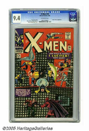 <B>X-Men #20 (Marvel, 1966) CGC NM 9.4 Off-white pages.</B></I> Readers got a look at Professor X's past in this issue, as he revealed how he lost the use of his legs at the hands of Lucifer. In the story, the X-Men battle Lucifer as well as Unus and the Blob. The art is by Werner Roth (as Jay Gavin) and Dick Ayers. Overstreet 2005 NM- 9.2 value = $270. CGC census 5/05: 12 in 9.4, 5 higher.