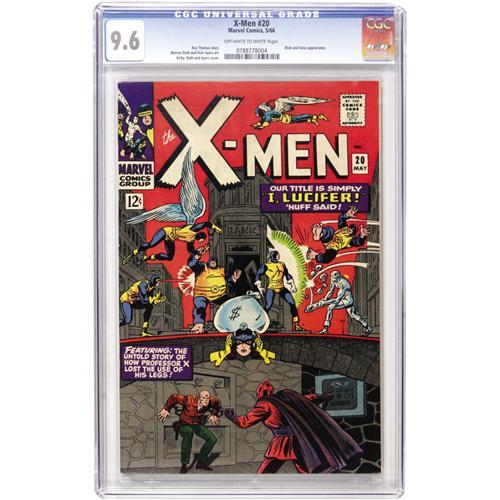 <B>X-Men #20 (Marvel, 1966) CGC NM+ 9.6 Off-white to white pages.</B></I> This is the nicest copy we've ever offered of this issue! Professor X told how he lost the use of his legs at the hands of Lucifer here. The cover and interior art is by Werner Roth (under the <I>nom de Marvel</B></I> Jay Gavin) and Dick Ayers. Overstreet 2006 NM- 9.2 value = $280. CGC census 3/07: 6 in 9.6, none higher.<BR><BR><b>Shipping:</b> Comics - Slabbed (certified) (<a target="_blank" href="http://www.heritageauctions.com/common/shipping.php">view shipping information</a>)