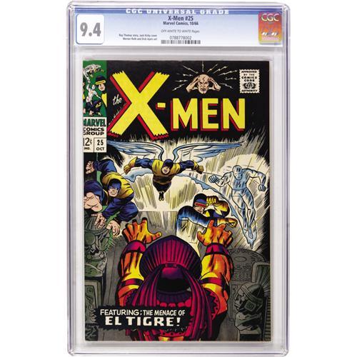 <B>X-Men #25 (Marvel, 1966) CGC NM 9.4 Off-white to white pages.</B></I> The Merry Mutants take on a kook named Kukulcan, aka El Tigre. Werner Roth is the artist. Overstreet 2006 NM- 9.2 value = $195. CGC census 3/07: 25 in 9.4, 12 higher.<BR><BR><b>Shipping:</b> Comics - Slabbed (certified) (<a target="_blank" href="http://www.heritageauctions.com/common/shipping.php">view shipping information</a>)