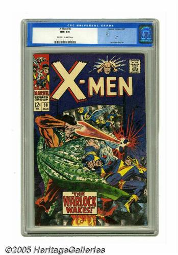 <B>X-Men #30 (Marvel, 1967) CGC NM 9.4 Off-white to white pages.</B></I> In this issue, "The Warlock Wakes." No, not the hero Warlock (Adam to his friends), but rather the baddie who would return to vex the men of X in issue #47, under the name Maha Yogi. The issue's cover is by Jack Kirby, and the interior story is drawn by guest artist Jack Sparling. Only five copies of this issue have been certified with higher grades by CGC as of this writing. Overstreet 2005 NM- 9.2 value = $190. CGC census 6/05: 16 in 9.4, 5 higher.