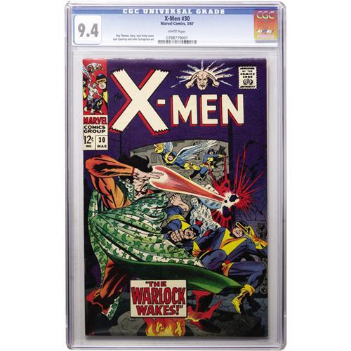<B>X-Men #30 (Marvel, 1967) CGC NM 9.4 White pages.</B></I> Jack Kirby drew the cover for this issue, which features Mad Merlin from <B>Journey Into Mystery</B></I> #96, now calling himself Warlock. Overstreet 2006 NM- 9.2 value = $195. CGC census 3/07: 19 in 9.4, 5 higher.<BR><BR><b>Shipping:</b> Comics - Slabbed (certified) (<a target="_blank" href="http://www.heritageauctions.com/common/shipping.php">view shipping information</a>)