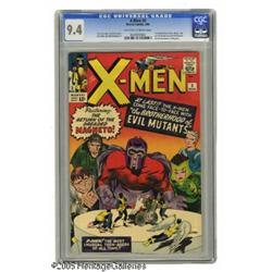 <B>X-Men #4 (Marvel, 1964) CGC NM 9.4 Off-white to white pages.</B></I> In addition to impressively brilliant color and gloss, and Jack Kirby's great cover and art, this issue has a lot of "firsts." Within the pages of this issue we're treated to the first appearances of Quicksilver, Scarlet Witch, Toad, and Mastermind, collectively comprising the Brotherhood of Evil Mutants. It's also the second appearance of the mutant master of magnetism himself -- Magneto. Only one copy of this issue has been graded higher by the CGC to date. Overstreet 2004 NM- 9.2 value = $1,400. CGC census 1/05: 12 in 9.4, 1 higher. <I>From the Northern Lights Collection.</B></I>