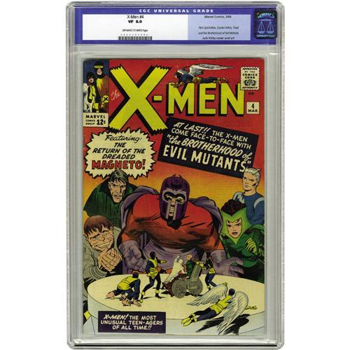 <B>X-Men #4 (Marvel, 1964) CGC VF 8.0 Off-white to white pages.</B></I> This is the first group appearance of the X-Men's opposite numbers, namely the Brotherhood of Evil Mutants. Their leader, Magneto, had been in one previous issue, but appearing for the very first time here are Quicksilver, the Scarlet Witch, the Toad, and Mastermind. Jack Kirby drew all of these evil souls... and the good guys too. Overstreet 2006 VF 8.0 value = $723. CGC census 3/06: 20 in 8.0, 52 higher.