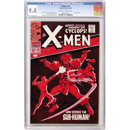 <B>X-Men #41 (Marvel, 1968) CGC NM 9.4 Off-white to white pages.</B></I> The X-Men battle Grotesk. The backup feature continues Cyclops' origin story. George Tuska cover. Overstreet 2006 NM- 9.2 value = $135. CGC census 3/07: 16 in 9.4, 1 higher.<BR><BR><b>Shipping:</b> Comics - Slabbed (certified) (<a target="_blank" href="http://www.heritageauctions.com/common/shipping.php">view shipping information</a>)