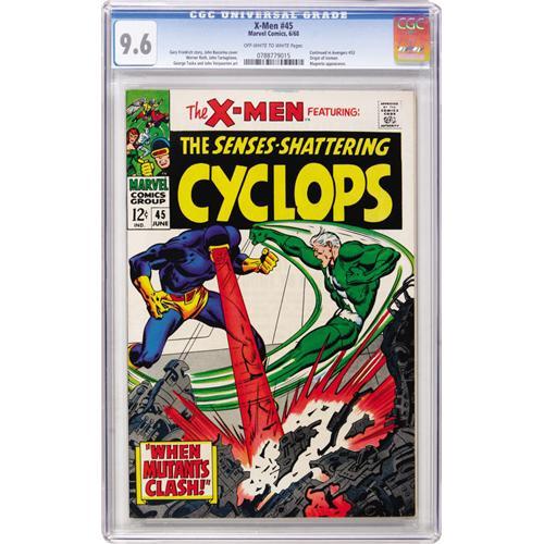 <B>X-Men #45 (Marvel, 1968) CGC NM+ 9.6 Off-white to white pages.</B></I> Quicksilver appearance. Magneto also appears. Origin of Iceman. Art by Don Heck, Werner Roth, and John Tartaglione. Overstreet 2006 NM- 9.2 value = $135. CGC census 2/07: 32 in 9.6, 5 higher.<BR><BR><b>Shipping:</b> Comics - Slabbed (certified) (<a target="_blank" href="http://www.heritageauctions.com/common/shipping.php">view shipping information</a>)