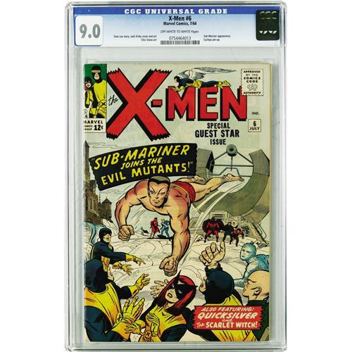 <B>X-Men #6 (Marvel, 1964) CGC VF/NM 9.0 Off-white to white pages.</B></I> Stan Lee had the perfect tie-in for the Sub-Mariner's appearance here: since Subby was <I>born</B></I> with his powers... that makes him a mutant! That thought occurs to both Professor X and Magneto, and the race to recruit Namor is on, in this issue scripted by Lee and drawn by Jack Kirby. Overstreet 2006 VF/NM 9.0 value = $666; NM- 9.2 value = $925. CGC census 3/06: 22 in 9.0, 22 higher.