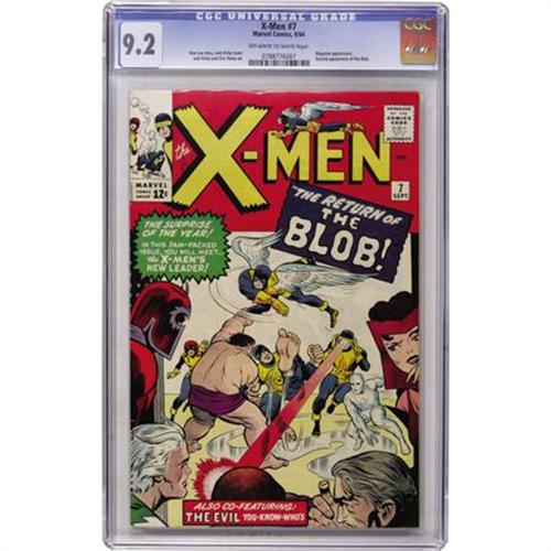 <B>X-Men #7 (Marvel, 1964) CGC NM- 9.2 Off-white to white pages.</B></I> This is the issue in which Professor X appoints Cyclops as the leader of the X-Men, and soon they must battle Magneto and his Brotherhood of Evil Mutants. This issue also has the first appearance of the mutant-detection device Cerebro. Jack Kirby provided the cover and art. Overstreet 2007 NM- 9.2 value = $975. CGC census 6/07: 14 in 9.2, 7 higher.<BR><BR><b>Shipping:</b> Comics - Slabbed (certified) (<a target="_blank" href="http://www.heritageauctions.com/common/shipping.php">view shipping information</a>)