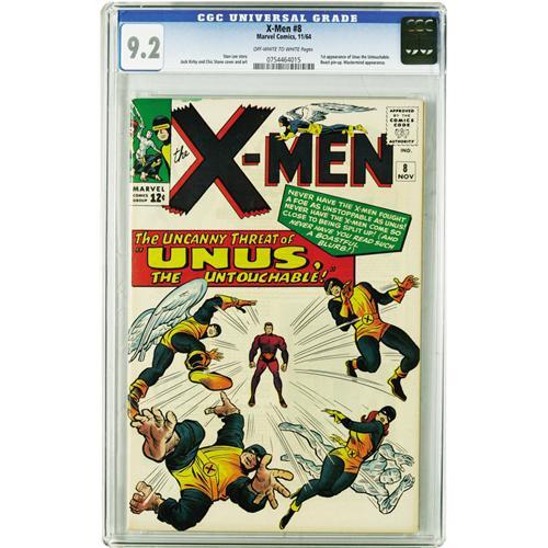 <B>X-Men #8 (Marvel, 1964) CGC NM- 9.2 Off-white to white pages.</B></I> It's the first appearance of Unus the Untouchable, who would pop up several more times in the original X-Men's run. Jack Kirby provided the cover and interior art. Overstreet 2006 NM- 9.2 value = $700. CGC census 3/06: 11 in 9.2, 12 higher.