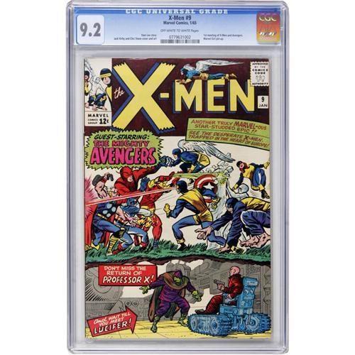 <B>X-Men #9 (Marvel, 1965) CGC NM- 9.2 Off-white to white pages.</B></I> Since the Timely days, through the Atlas era, and into the Marvel Age, whenever superheroes converge, it seems a fight has to break out! Witness the Jack Kirby cover, which has the Avengers meeting the X-Men for the first time -- and it ain't for tea! The issue also has the first appearance of Lucifer and a Marvel Girl pin-up (yessss!). Overstreet 2006 NM- 9.2 value = $700. CGC census 3/07: 15 in 9.2, 19 higher.<BR><BR><b>Shipping:</b> Comics - Slabbed (certified) (<a target="_blank" href="http://www.heritageauctions.com/common/shipping.php">view shipping information</a>)