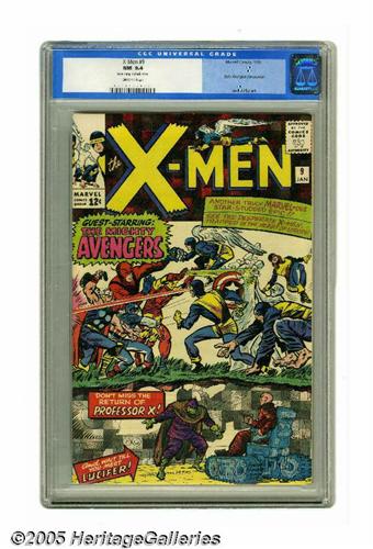 <B>X-Men #9 (Marvel, 1965) CGC NM 9.4 Off-white pages.</B></I> The X-Men and the Avengers meet for the first time and -- as in most super-team cross-overs -- they pound the bejeebers out of each other before finally uniting against a common foe. In this instance it's Lucifer, who makes his first appearance here. Jack Kirby provides the cover and art. CGC notes: "Date stamp on back cover," otherwise it's a very nice copy out-graded by only two others. Overstreet 2005 NM- 9.2 value = $650. CGC census 7/05: 12 in 9.4, 2 higher.