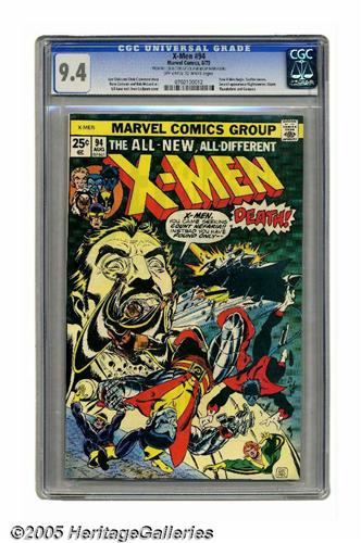 <B>X-Men #94 (Marvel, 1975) CGC NM 9.4 Off-white to white pages.</B></I> This issue had key events aplenty. Not only was it the second appearance of the new X-Men, it showed the original members promptly packing their bags to leave the team (one "new" X-Man, Japanese mutant Sunfire, also said <I>sayonara</B></I> here, after only one adventure with the group). This issue, the first appearance of the new team in the regular X-Men title, is #3 on Overstreet's list of the most valuable Bronze Age books. The cover is by Gil Kane, and the interior art is by Dave Cockrum. Overstreet 2005 NM- 9.2 value = $1,000. CGC census 7/05: 78 in 9.4, 16 higher. <I>From the collection of Joe and Nadia Mannarino.</B></I>