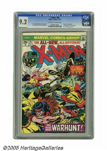 <B>X-Men #95 (Marvel, 1975) CGC NM- 9.2 Off-white to white pages.</B></I> Death of Thunderbird. Third appearance of the new X-Men. Count Nefaria appearance. Gil Kane cover. Dave Cockrum art. Overstreet 2005 NM- 9.2 value = $200. CGC census 3/05: 61 in 9.2, 90 higher. <I>From the Northern Lights Collection.</B></I>