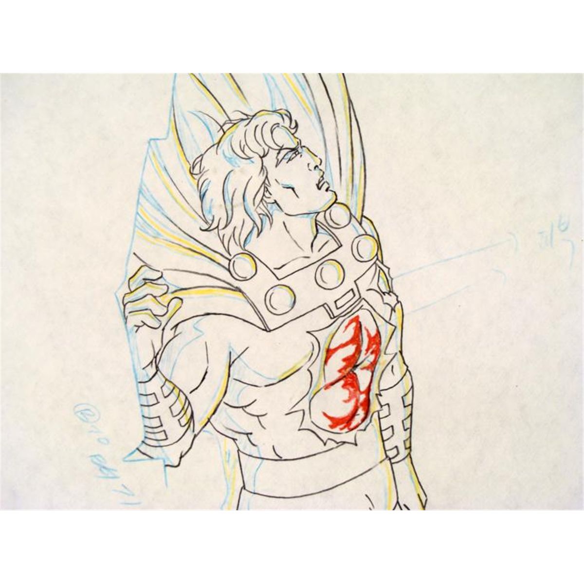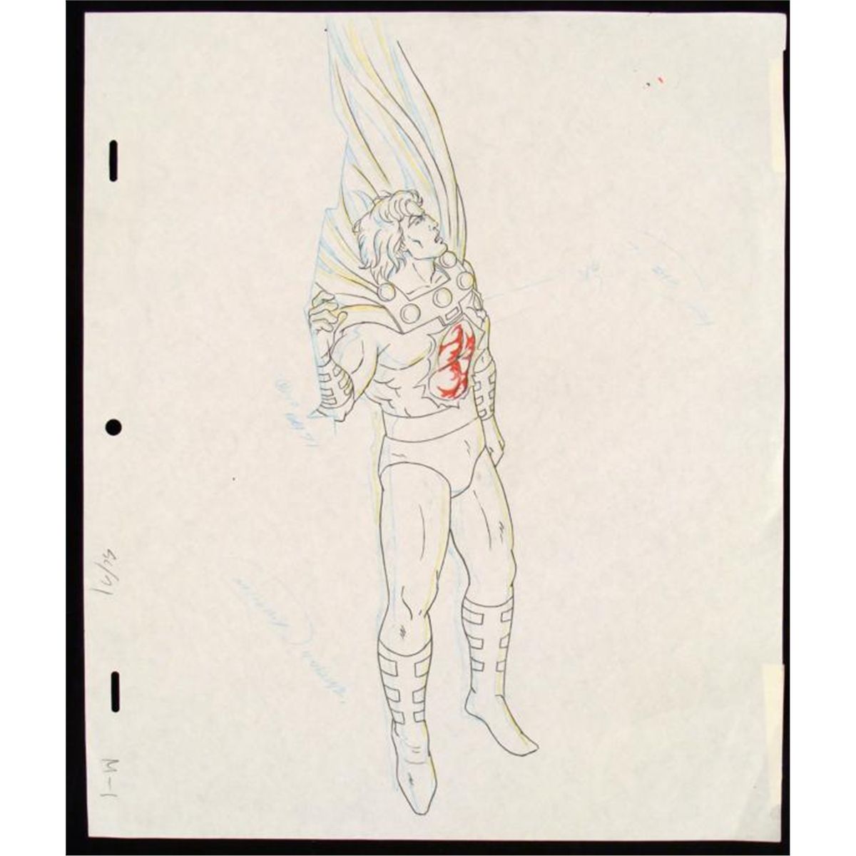 Under a cloud of increasing anti-mutant sentiment, Professor Xavier creates a haven at his Westchester mansion to train young mutants to use their powers for the benefit of humanity, and to prove mutants can be heroes. Xavier recruited Cyclops, Iceman, Angel, Beast and Jean Grey calling them "X-Men" because they possessed the "x-gene", an ability normal humans lacked. Early issues introduced the team's arch enemy, Magneto and his Brotherhood of Evil Mutants, who would later battle the X-Men for years. * A little help here... * * Original "rough" animation drawing, in non-photo blue, black, and yellow with the notations in non-photo blue.Overall size is a 12-field drawing that is 10 1/2" × 12 1/2" Excellent condition Traditional animation is a multi-step process which includes various types of art techniques. Drawings are a key part of the process, in which the animator creates the design and movement of the characters. Drawings are then transferred onto acetate cels (by hand-inking and/or photo copying) to create a production cel, which is then hand painted on the back side, using paint colors chosen and approved by the creator of the series. * The drawing is ready to be matted and framed. The animators notations are located at the top and bottom of the drawing.