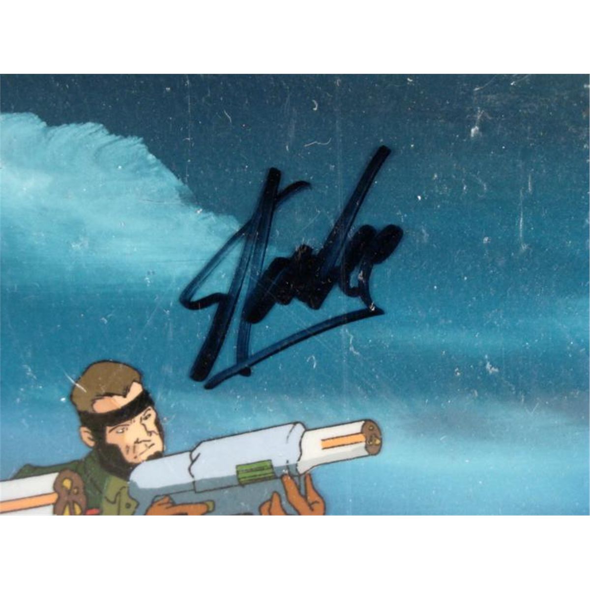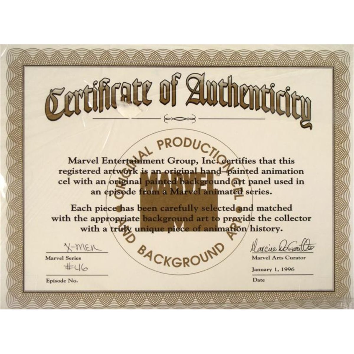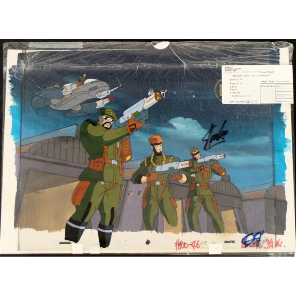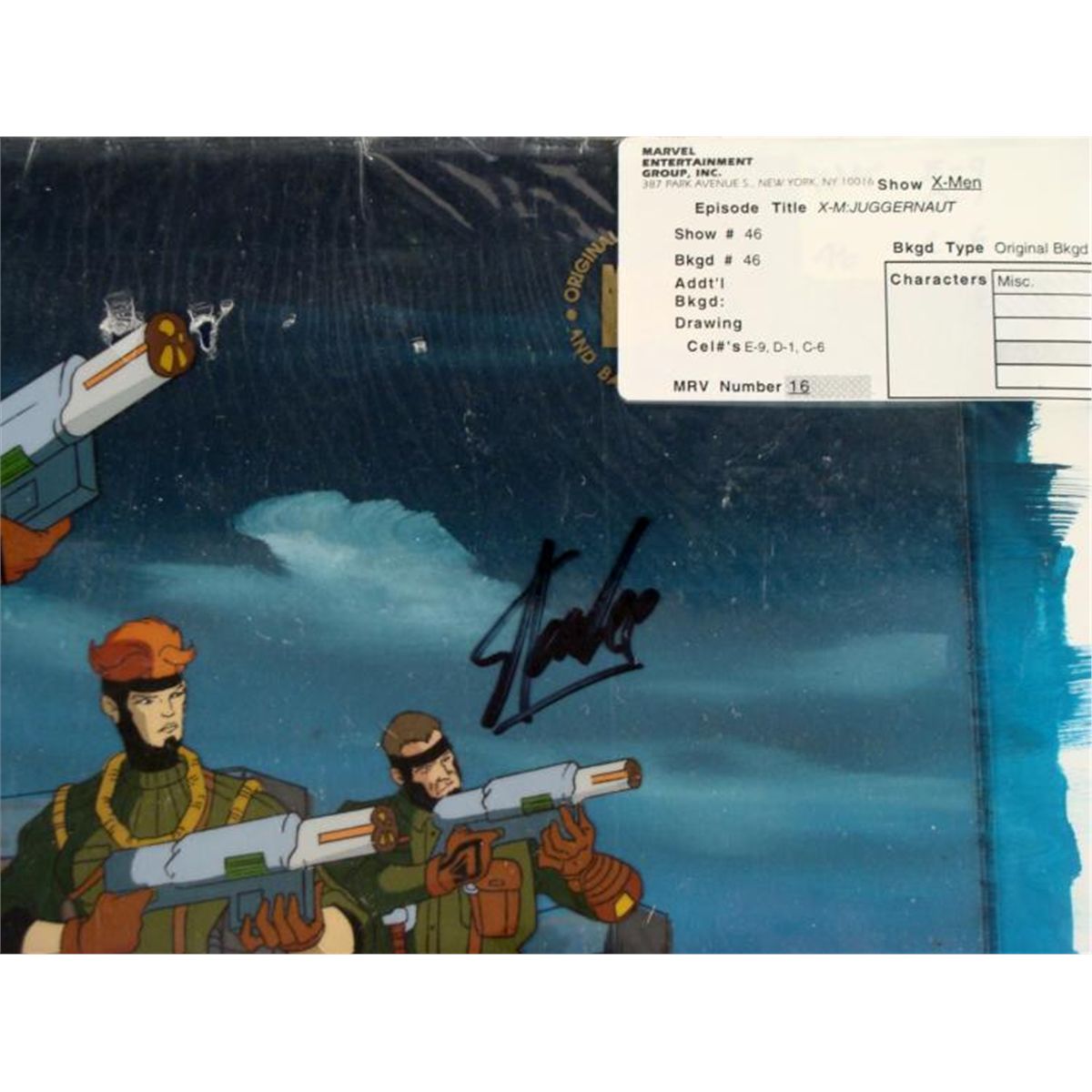 This is an original signed production cel and background are from the hit series X-Men. Stan Lee signature is located at the top right of cel in black sharpie. * Under a cloud of increasing anti-mutant sentiment, Professor Xavier creates a haven at his Westchester mansion to train young mutants to use their powers for the benefit of humanity, and to prove mutants can be heroes. Xavier recruited Cyclops, Iceman, Angel, Beast and Jean Grey calling them "X-Men" because they possessed the "x-gene", an ability normal humans lacked. Early issues introduced the team's arch enemy, Magneto and his Brotherhood of Evil Mutants, who would later battle the X-Men for years. * FREEZE!! Don't move or we will have to open fire... * Original Animated Cel Overall Size of the Cel: 10 1/2" x 12 1/2" Overall Size of the background: 10 1/4" x 14 1/4" Excellent Condition This is an original hand-painted cel set-up used in the production of an episode of X-Men titled "Juggernaut." Each one-of-a-kind set-up represents a slight change in position of the characters. When individually photographed and projected in rapid succession, the images appear to move. * To create production cels, the original animator's drawing is transferred onto an acetate cel (by hand-inking and/or photo copying). The cel is then hand-painted on the reverse side. The background accompanying this set-up is an original production background. * The cel and original background is ready to be matted and framed. The animators notations are located at the bottom of cel and background. A ceritificate of Authenticity from Marvel is on the back of background. The Marvel Seal is located at the top right of the cel. The cel and background are in a protective sleeve An information card about the episode is located at the top right of the protective sleeve. *