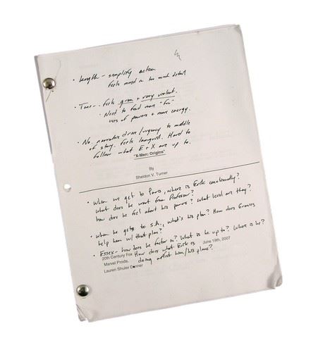 X-Men Origins Rare First Draft Screenplay With Studio Executive Notes - So much press is lavished on the creators of a film, that one forgets that these projects are financed by studios who have a vested interest in making sure the film comes out the way they want (that is: makes a ton of money!). Therefore, from the earliest days of the silent films, to the present, there have been "silent powers", known as the Studio Executives, who not only made copious notes that shaped the future of their films, but in most cases has final power as to exactly what we see on the screen in the end. This is a fascinating and rare example. For "X-Men Origins: Wolverine" (2009), this is a high level 20th Century Fox Studio Executive's notes on the first draft screenplay dated June 19th, 2007. His elaborate notes are absorbing entertainment on their own, especially when you read the script, and see how much it changed and developed from this version to the final film. The script changed so much that the original writer of this version did not make the final arbitration, and two other writers received the final credit from their draft. This was an extremely confidential script, and only a small amount of copies were ever produced to give to the top creative production personnel. This is one of these limited edition inner-office copies.