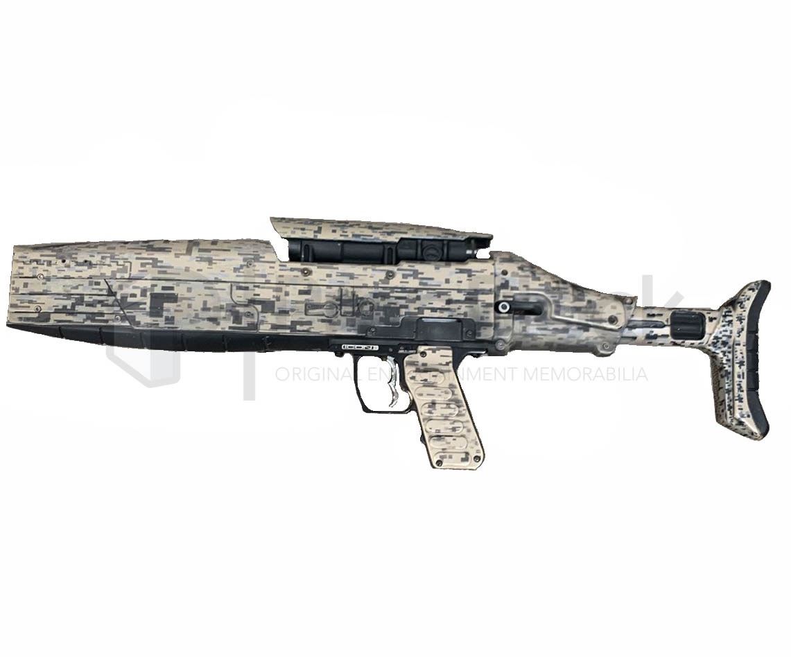 "Cure" style military rifle featured in the production of the 2006 superhero film X-Men: The Last Stand. This style rifle can be seen during the final battle of the film when the military personnel are being armed with plastic rifles containing the cure for the mutant gene. This piece is was altered from a paintball rifle and is made of resin and plastic, featuring an extended stock and scope. This item remains in excellent, production used condition.