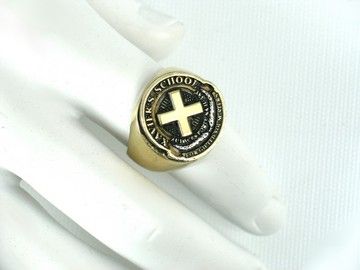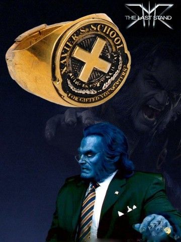 From "X-Men: The Last Stand" (2006), this is one of "The Beast's" (Kelsey Grammer) screen worn "Xavier's School X" rings. The Beast was Hank McCoy, the Mutant Ambassador for the US Government with super-powers of invulnerability and the ability to stick to the ceiling with his feet! The ring is made of heavy faux-gold and includes the special "X" logo in the center, along with the school's Latin motto:" Audentes fortuna iuvat" (Fortune favors the bold). Witten under it in English is: "Xavier's School for Gifted Youngsters". Most likely used in close-up shots as well. Ring is "oversized" to fit The Beast's prosthetic "glove" hand. Comes with a COA.