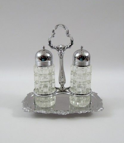 X-Men Xavier Mansion Salt And Pepper Shaker & Tray Prop - Based on the classic Marvel comics, "X-Men" (2000) tells the story of a group of "Mutants" each with their own unique powers who, under the leadership of Professor Charles Xavier (Patrick Stewart), work to keep evil forces from their mission to exterminate the human race. This is an exquisite set of Victorian style faux-cut glass and faux-sterling silver salt and pepper shakers and holding try used as a background prop in Xavier's mansion set. (Approx. 7 1/2" x 8").