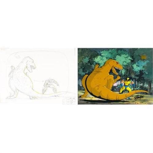 <B>X-Men the Animated Series Animation Production Cel and Clean-Up Drawing Original Art (Marvel, 1992).</B></I> Wolverine dukes it out with a Tyrannosaurus Rex, in this original hand painted cel and original background. Also includes the original clean-up drawing used to create the cel. Each measures approximately 12" x 9", and are attractively matted and framed. Signed by Stan Lee.<BR><BR><b>Shipping:</b> Framed - with Glass, Large (<a target="_blank" href="http://www.heritageauctions.com/common/shipping.php">view shipping information</a>)