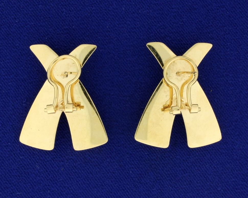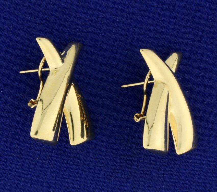 In 14k yellow gold, 1 1/8" long with post and clip backs for safety. 6.8g.