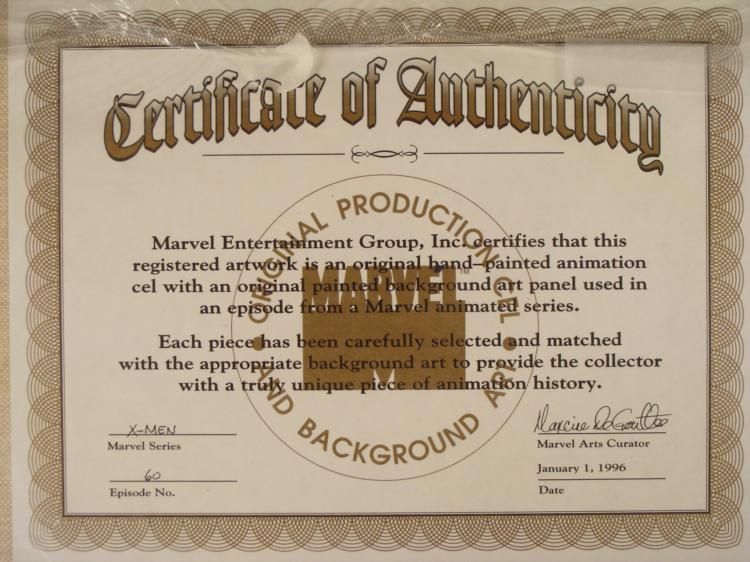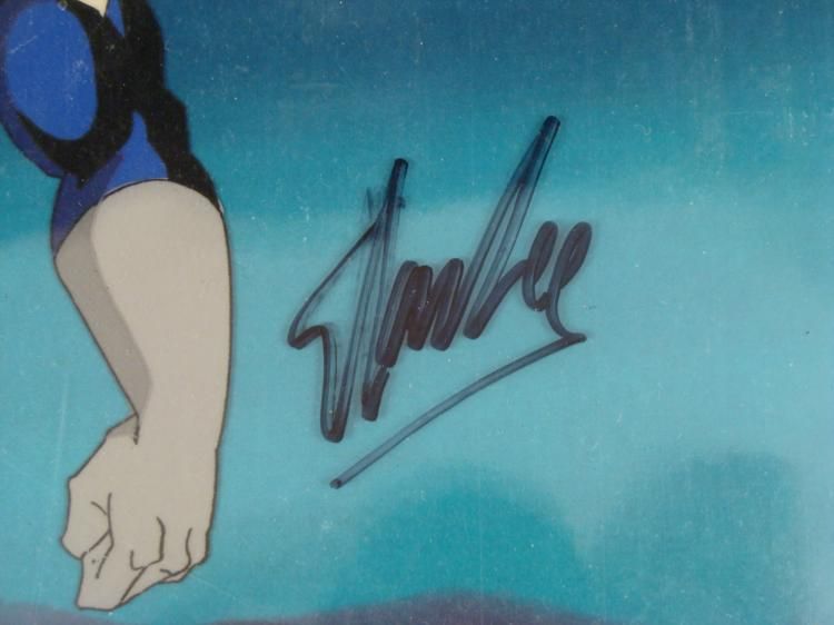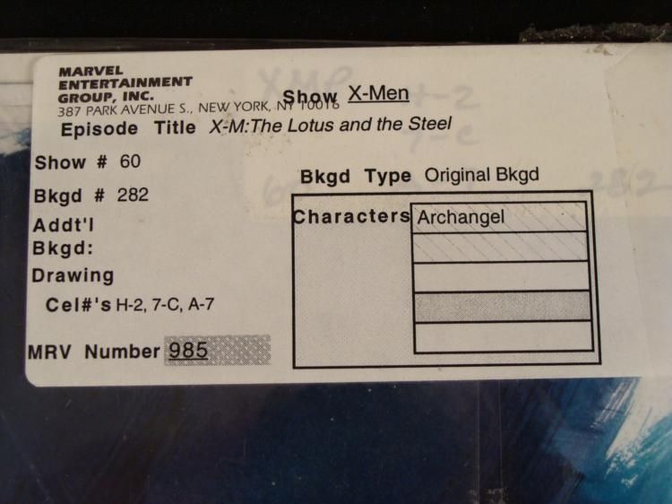 This is an original signed production cel and background from the hit series X-Men. Stan Lee signature is located on the right of cel in black sharpie. * Under a cloud of increasing anti-mutant sentiment, Professor Xavier creates a haven at his Westchester mansion to train young mutants to use their powers for the benefit of humanity, and to prove mutants can be heroes. Xavier recruited Cyclops, Iceman, Angel, Beast and Jean Grey calling them "X-Men" because they possessed the "x-gene", an ability normal humans lacked. Early issues introduced the team's arch enemy, Magneto and his Brotherhood of Evil Mutants, who would later battle the X-Men for years. * Archangel has awesome wings * * Original Animated Cel & Production BackgroundMedium: Hand painted acetate celDetails: Animation notations and peg holes * Overall Size of the Cel: 10 1/2" x 12 1/2" Overall Size of the background: 10 1/2" x 14 3/4" Excellent Condition This is an original hand-painted cel set-up used in the production of an episode of X-Men titled "The Lotus and the Steel." Each one-of-a-kind set-up represents a slight change in position of the characters. When individually photographed and projected in rapid succession, the images appear to move. * To create production cels, the original animator's drawing is transferred onto an acetate cel (by hand-inking and/or photo copying). The cel is then hand-painted on the reverse side. The background accompanying this set-up is an original production background. * The cel and original background is ready to be matted and framed. The cel has multiple layers. The animators notations are located at the bottom of the cel and background. A Certificate of Authenticity from Marvel is on the back of background. The Marvel Seal is located at the top right of the cel. The cel and background are in a protective sleeve. An information card about the episode is located at the top right of the protective sleeve. *