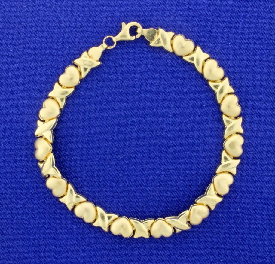 The bracelet is 10K yellow gold with a satin finish. It is 7 inches long and 6mm wide. 4.3g