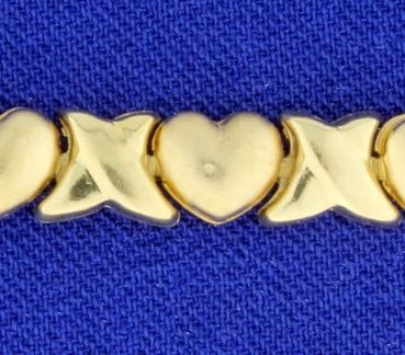 The bracelet is 10K yellow gold with a satin finish. It is 7 inches long and 6mm wide. 4.3g