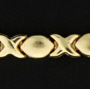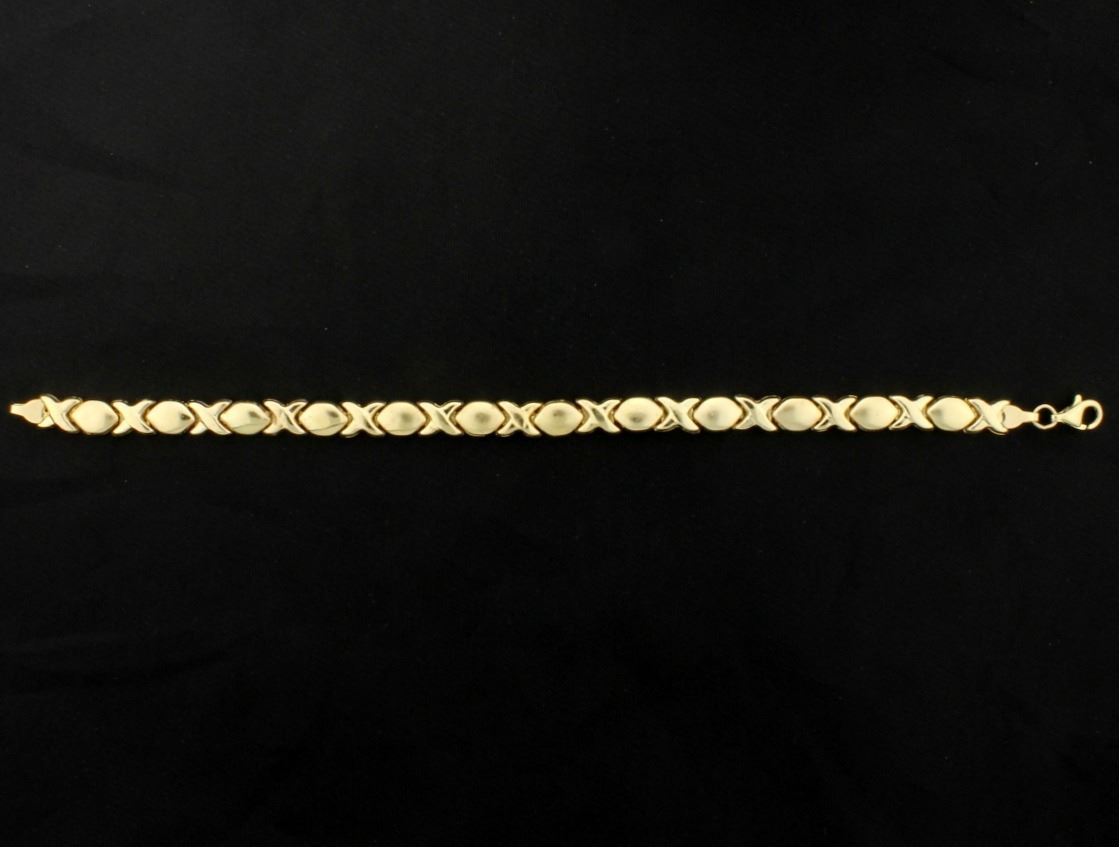 The bracelet is 10K yellow gold with a satin finish. It is 5.5mm wide. 4.1g