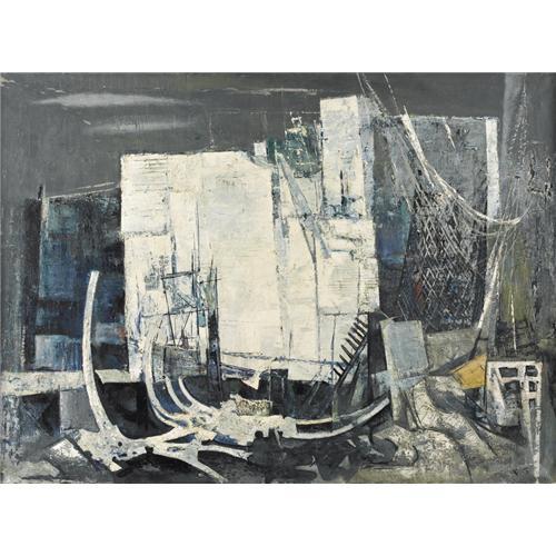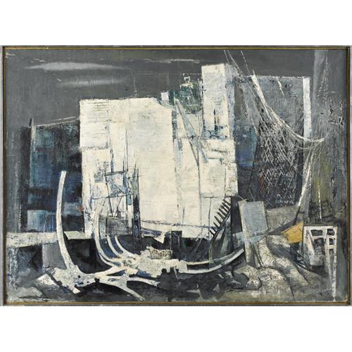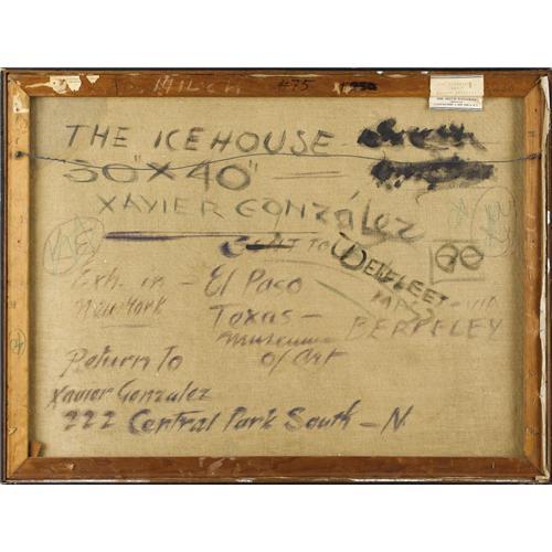 <B>XAVIER GONZALEZ (1898-1993)</B></I><BR><I>Ice House,</B></I> early 1940s<BR>Oil on canvas<BR>30in. x 40in.<BR>Signed lower right<BR>Signed and titled verso<BR><BR>This 1940s work by Xavier Gonzalez retains its Regionalist subject matter but it is more abstract and utilizes broad planes of color. The ice house in this painting, which should be a source of refreshment in the hot El Paso summer, is now derelict. It is surrounded by architectural remnants to the right and a dead cow skeleton to the left. Like its companions, ice houses were no longer needed in the 1940s, as household refrigeration became commonplace.<BR><BR>Provenance:<BR>Estate of Xavier Gonzalez<BR><BR>Exhibited:<BR>Butler Institute<BR>El Paso Museum of Art<BR>The Milch Galleries<BR><BR><BR><BR><b>Shipping:</b> Requires 3rd Party Shipping (<a target="_blank" href="http://www.heritageauctions.com/common/shipping.php">view shipping information</a>)