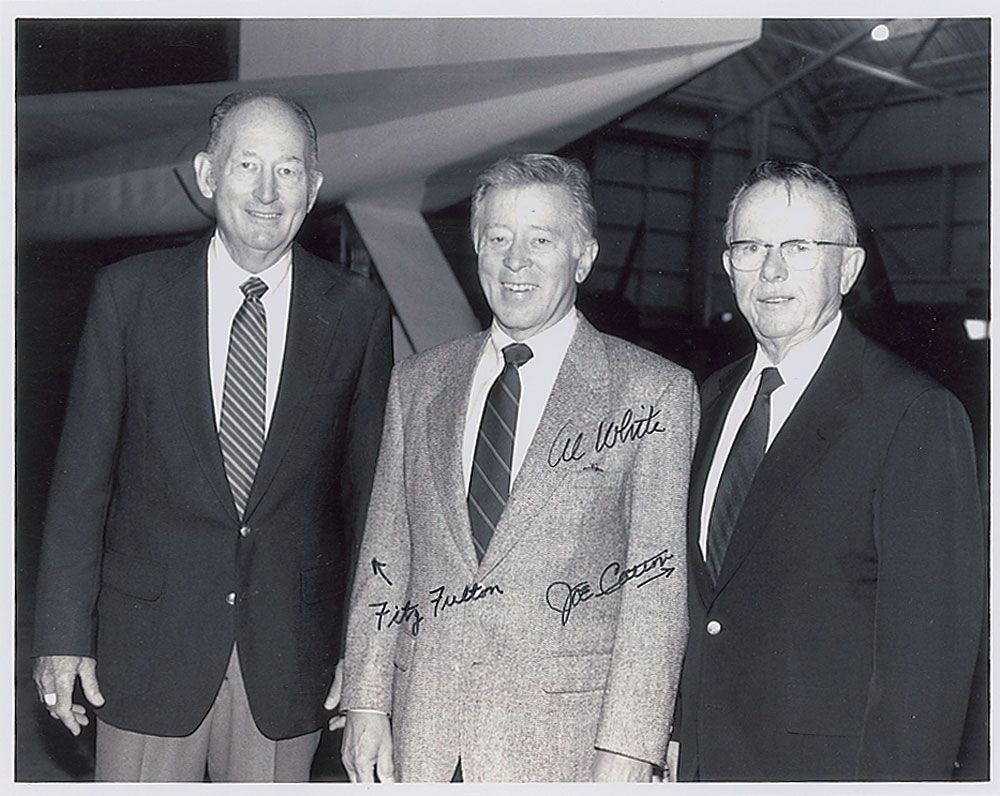 Glossy 10 x 8 photo of three XB-70 pilots posing together at a reunion, signed in black felt tip by Al White, Fitz Fulton, and Joe Cotton. In fine condition.