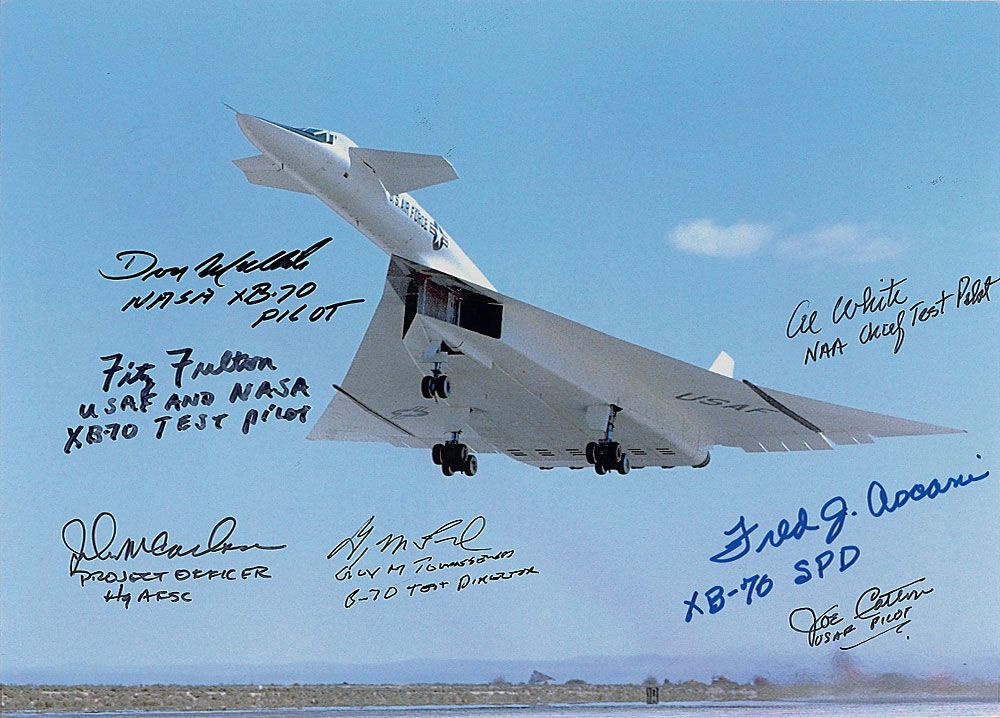 Color glossy 10 x 8 photo of the XB-70 taking off, signed in black felt tip by Al White, Joe Cotton, Fitz Fulton, Don Mallick, John Carlson, and Guy Townsend and in blue felt tip by Fred Ascani. Each pilot has added his flight assignment underneath his signature. In fine condition, with some bends and creases.