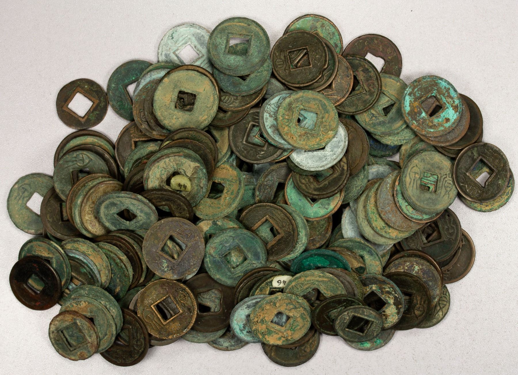 XIN: LOT of 190 coins, large group of huo quan coins cast 14-23 AD, including many different varieties, sizes, and weights, an interesting study lot, average quality examples, retail value $1500, lot of 190 coins. According to Fredrik Schjöth, Emperor Wang Mang wished to displace the Wu Zhu currency of the Western Han, owing, it is said, to his prejudice to the jin ('gold') radical in the character zhu of this inscription, which was a component part of the character Liu, the family name of the rulers of the House of Han, whose descendant Wang Mang had just dethroned. And so he introduced the Huo Quan currency.] One of the reasons, again, that this coin circulated for several years into the succeeding dynasty was, so the chroniclers say, the fact that the character quan in the inscription consisted of the two component parts bai ('white') and shui ('water'), which happened to be the name of the village, Bai Shui in Henan, in which the Emperor Guang Wu, who founded the Eastern Han, was born. This circumstance lent a charm to this coin and prolonged its time of circulation.