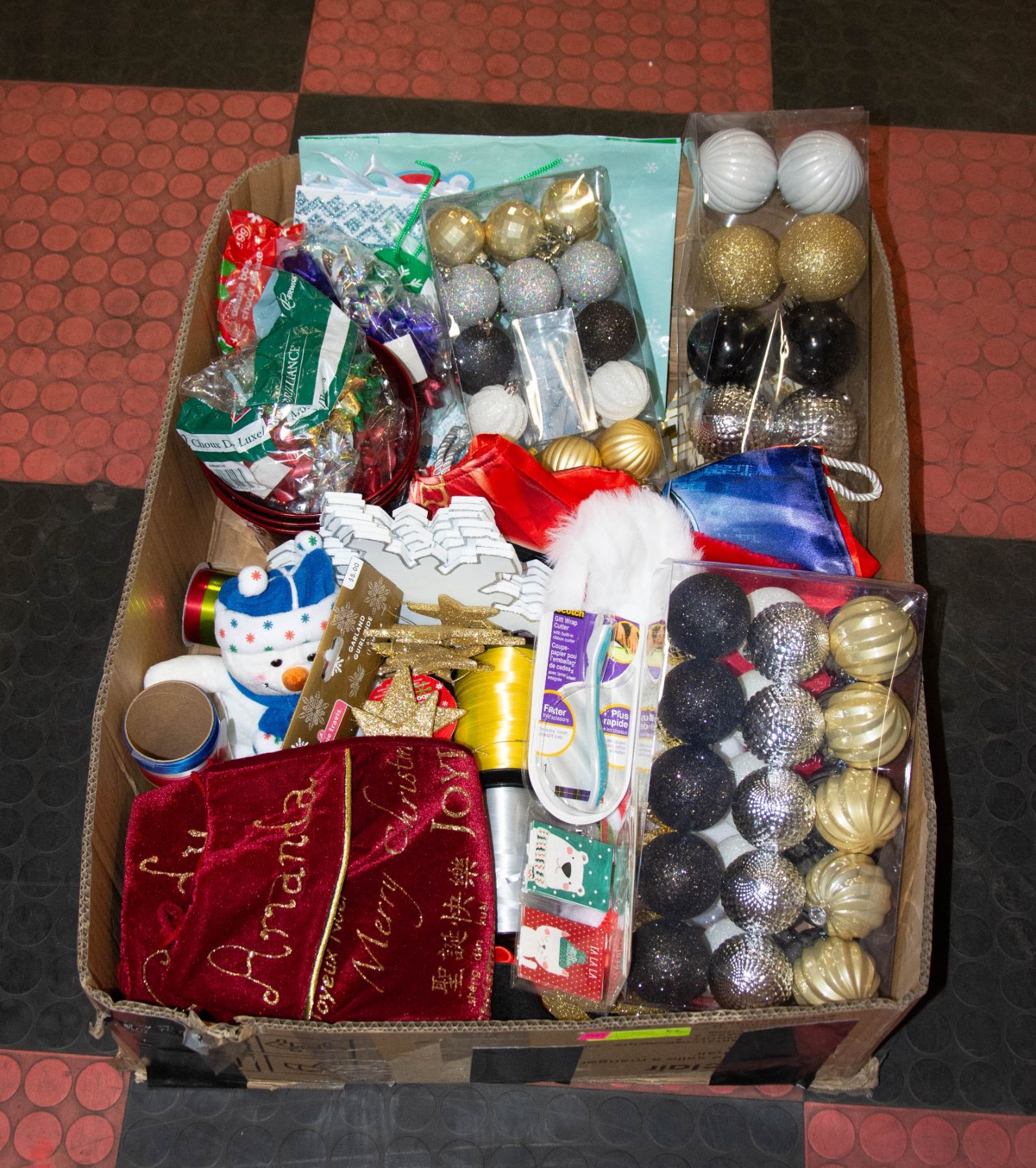 DECORATIONS, RIBBON, PAPER CUTTER, 2 BOXES OF CHRISTMAS CARDS, BOWS, BAGS, APRON, BATMAN & WONDER WOMAN STOCKINGS, GIFT TAGS, PLUSH STOCKINGS PERSONALIZED WITH "AMANDA" AND "CODY" NAMES **ALL ITEMS MUST BE REMOVED BY 5PM SATURDAY, DECEMBER 2ND 2023. ALL REMAINING ITEMS WILL BE SUBJECT TO A $6.00 PER DAY STORAGE CHARGE. ANY ITEMS REMAINING AFTER MONDAY, DECEMBER 18TH, 2023 WILL BE CONSIDERED FORFEITED. NO REFUNDS WILL BE ISSUED FOR FORFEITED ITEMS. TO SCHEDULE A PICK UP APPOINTMENT CLICK HERE