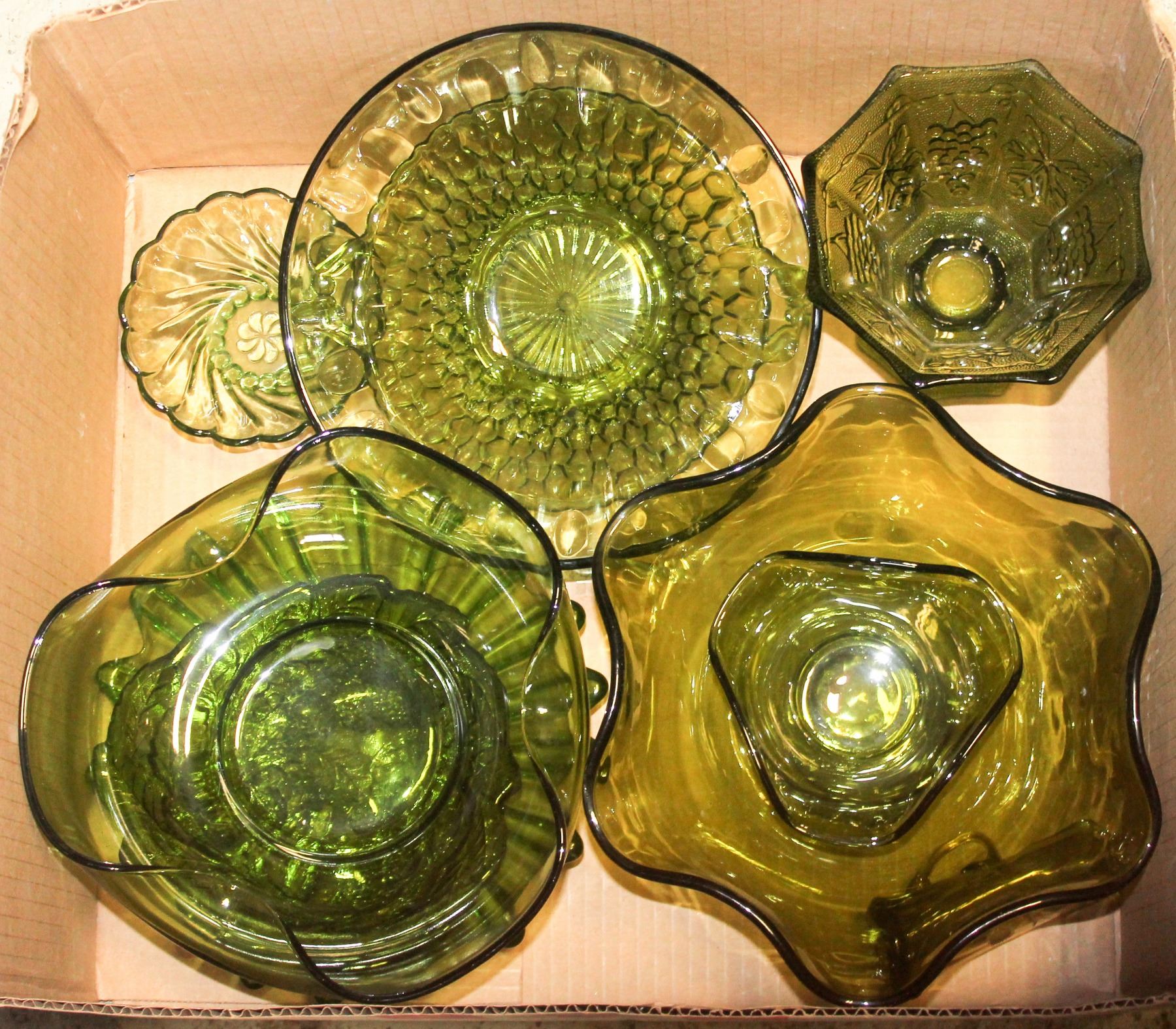 XL BOX OF VINTAGE GREEN DEPRESSION GLASS