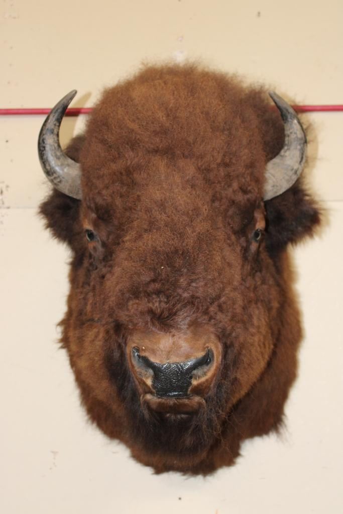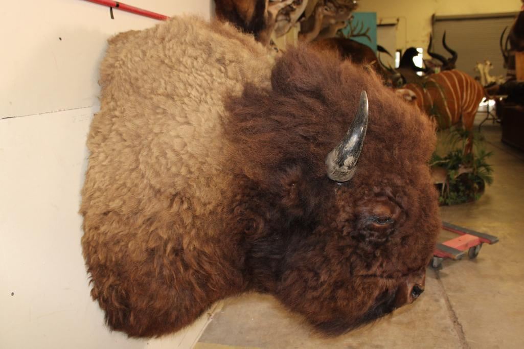 XL BUFFALO or BISON Shoulder Mount. His Left Horn measures 15 1/8" Long and the Right Horn measures 15.5" Long. The Mount measures 44" Tall x 27" Wide x 42" Depth (from the wall). It has a 25" Horn Spread and is in Good Condition. TAXIDERMY